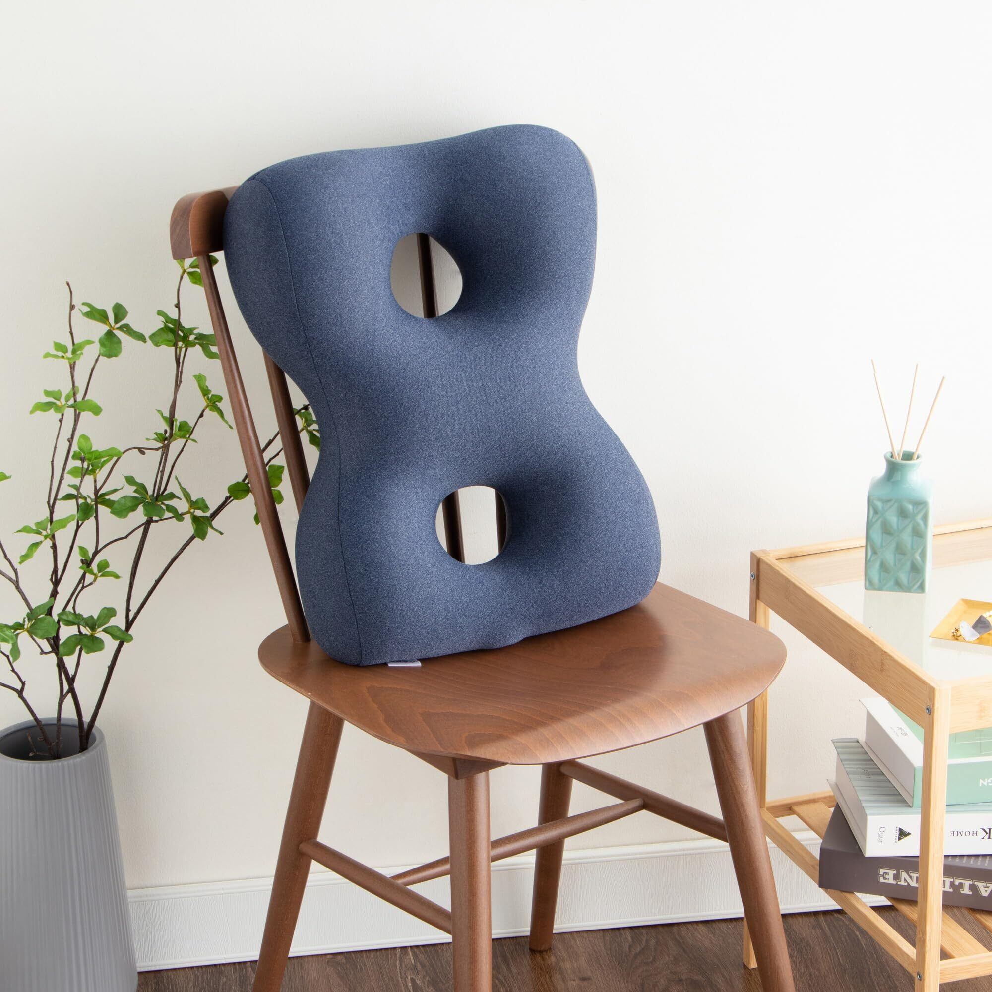 クッションの左右に配されたふくらみが、肋骨と骨盤を優しく包み込むようにサポートし、座る姿勢を安定させます。これにより、身体のぐらつきが抑えられ、自然で無理のない姿勢を保ちやすくなります。
