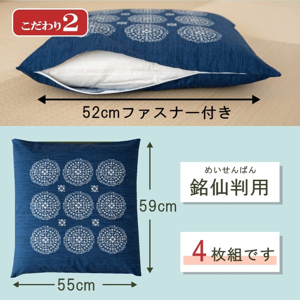 HAPPY SINGU RABO 【 日本製 】 座布団カバー 綿100% 王朝 ざぶとん カバー 三河産 【縦横均等柄だから整理整頓しやすく並べやすい】 和室 洋室 来客用 普段使い 業務用 飲食店 業務用 公民館 集会所 来客用 法事 会議室 (ネイビー(紺) 4枚組)