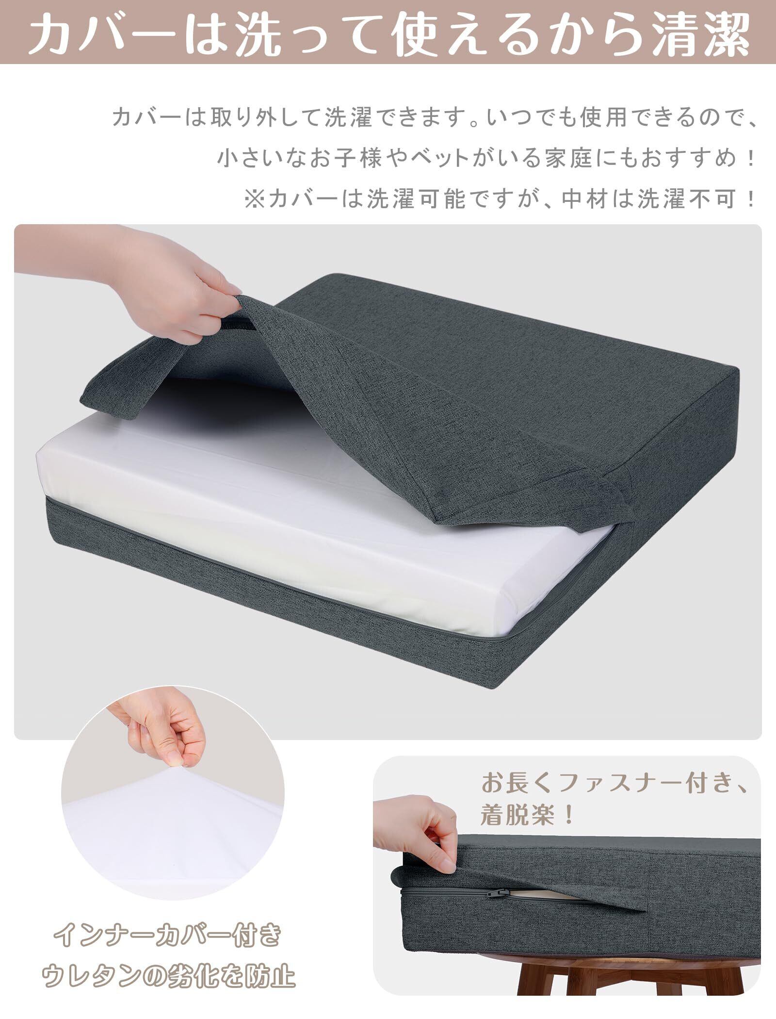 【洗えるカバー】ファスナー仕様、カバーを取り外して洗濯できます、いつでも清潔に保てることで、快適に過ごすことができます。洗える座面クッションのファスナーが広いなので、着脱も簡単。