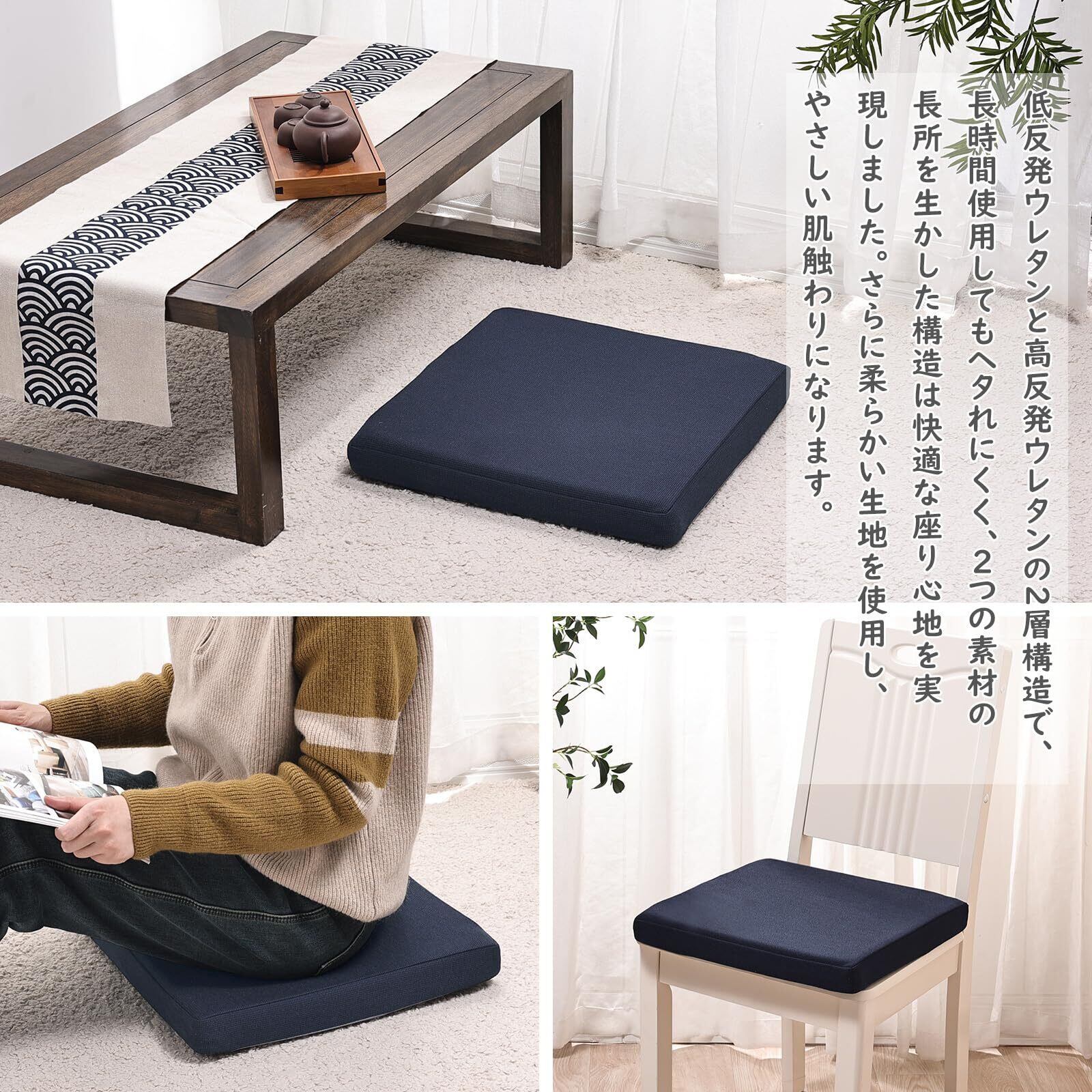 \【◆座布団 椅子 クッション 低反発+高反発 ウレタン クッション 42×42×5cm 2層構造 ネイビー カバー洗える◆】/