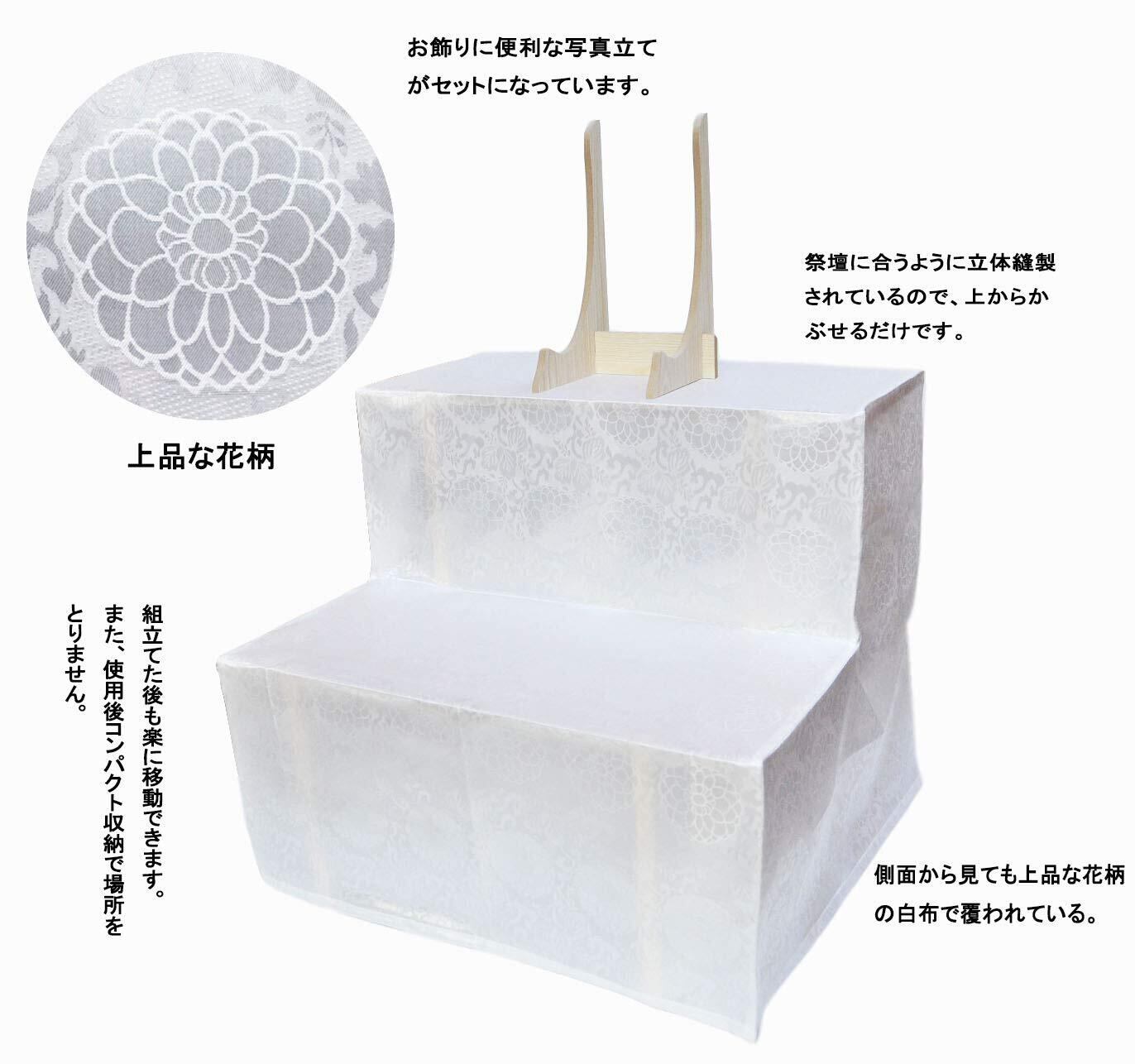 カバー付:白布を使い、祭壇に合うように立体縫製されているので、上からかぶせるだけで易しくかけられます。脇にも白布がしっかりかかるので、横から見ても本体の骨組み見えないすっきりとした仕上がりになります。