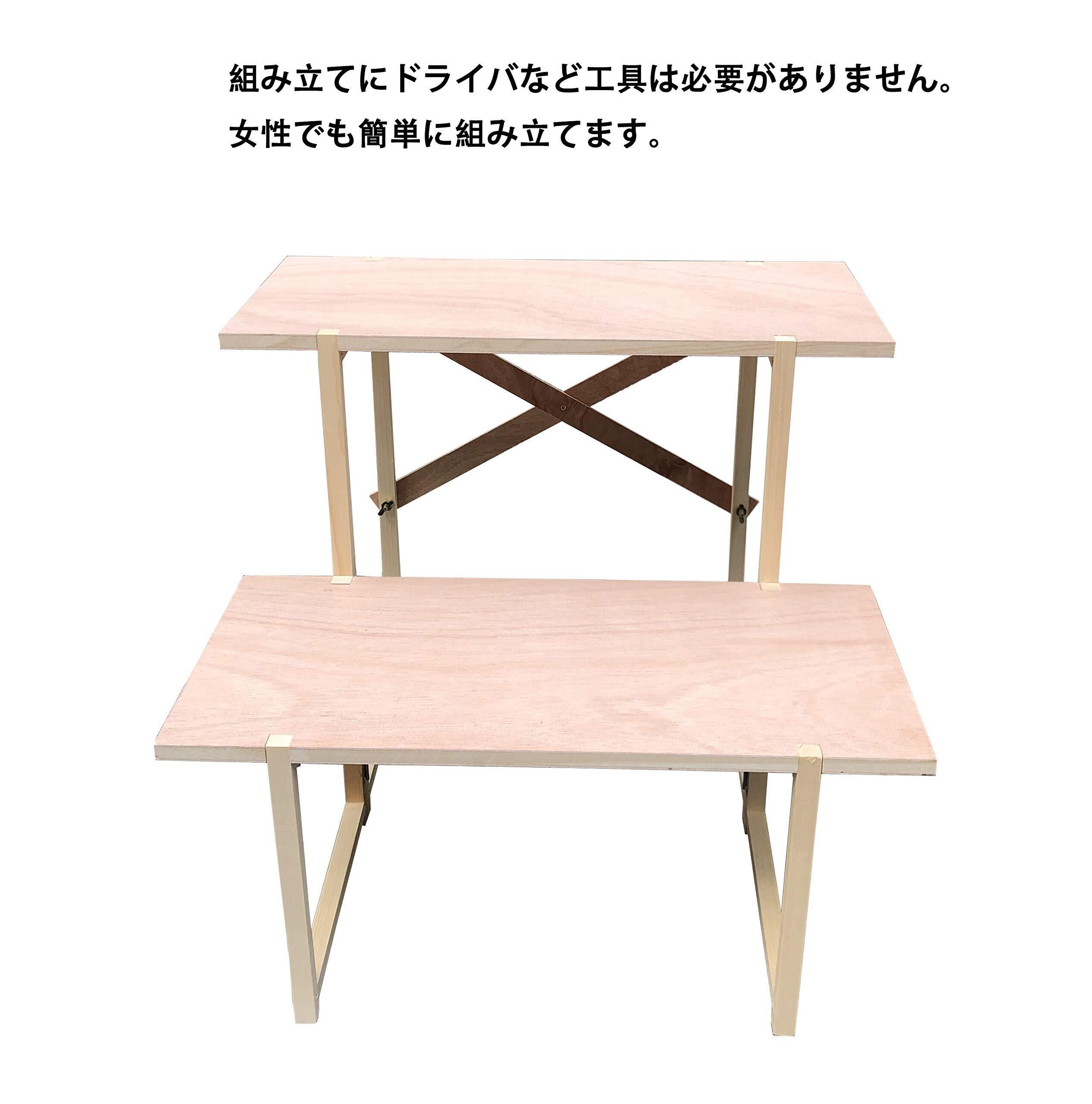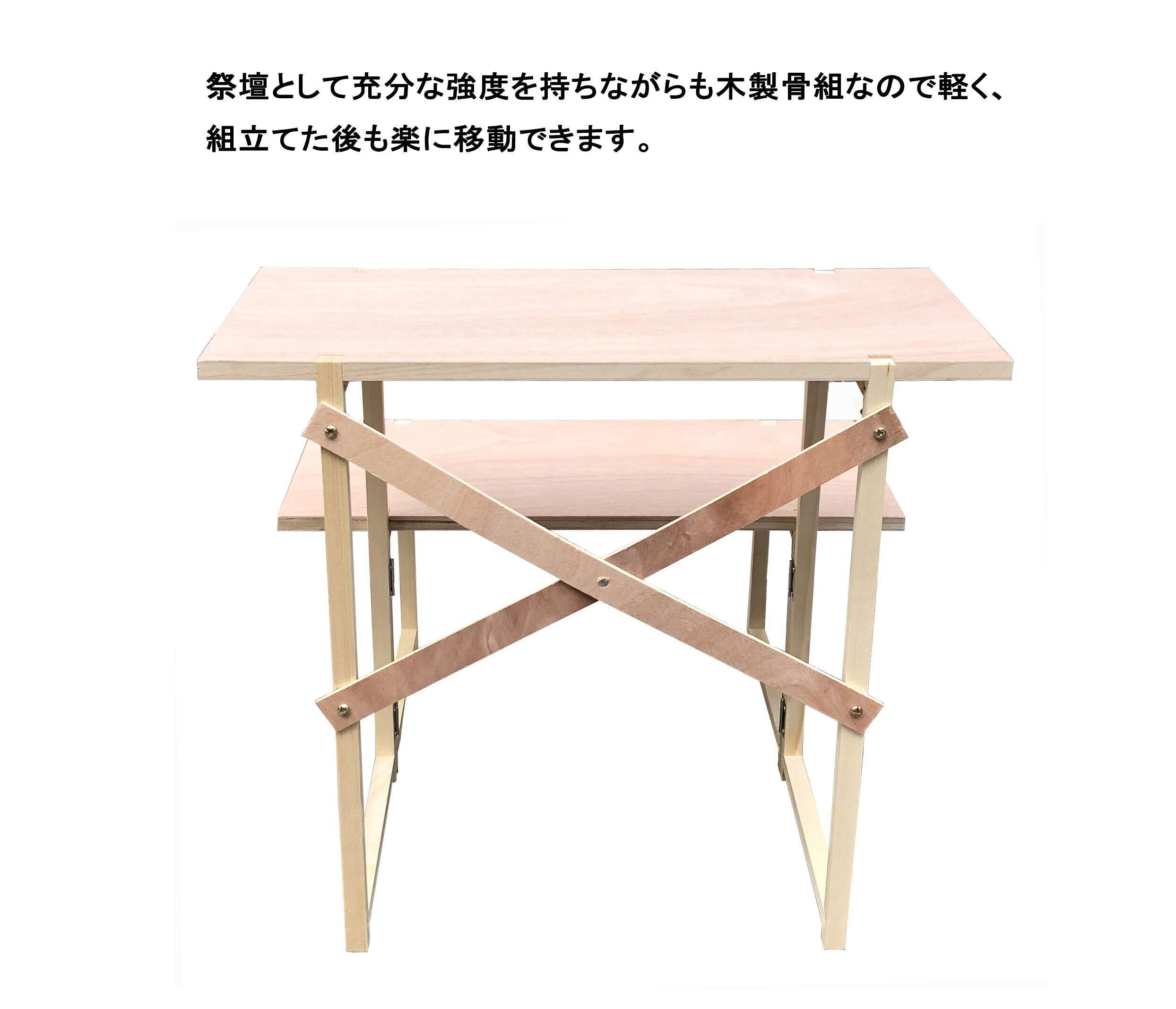 規格:総幅60×総高さ53×総奥行52cm(下段高さ28cm×下段棚板奥行27cm、2段目高さ25cm×2段目棚板奥行27cm) 重さ:3.5kg 材質:木製。備考:組み立て式(説明書付)、白布付き、写真立て付き(高さ29cm)