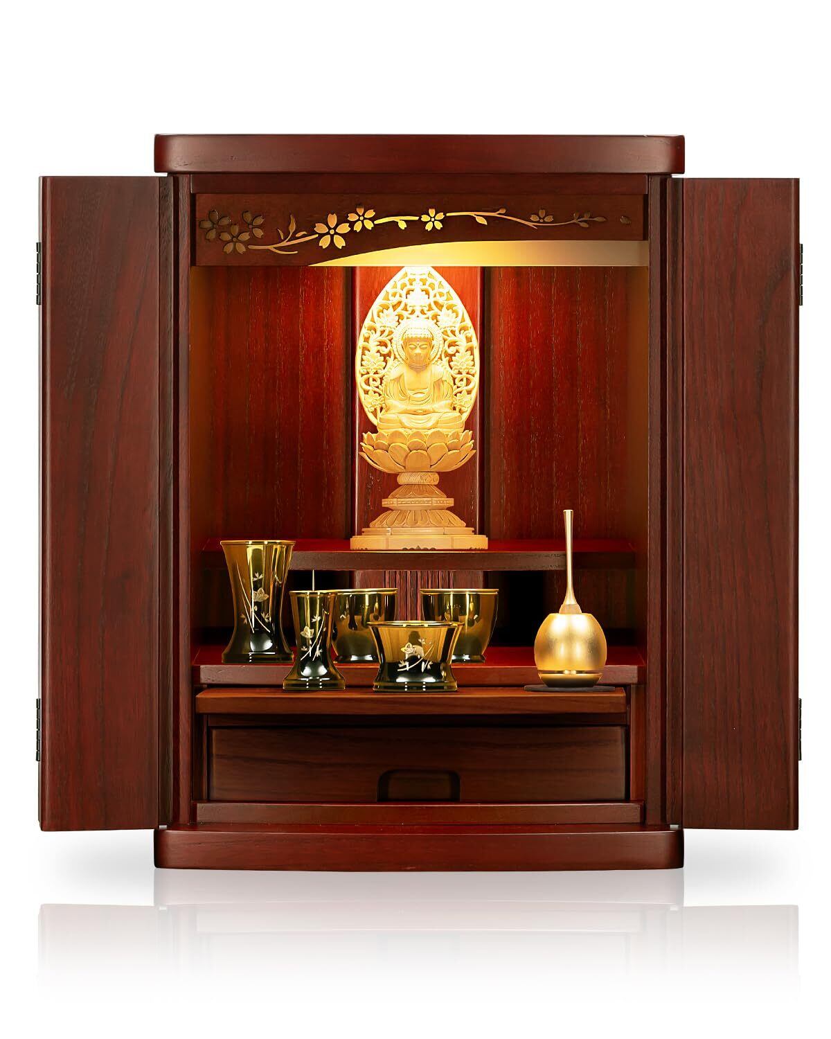 欄間の桜がほのかに光るモダンミニ仏壇 欄間の桜が内部のライトに照らされ美しく光るモダンミニ仏壇です。扉や内陣、背板を含めお仏壇全体を同じ色で統一して仕上げています。コンパクトなので設置スペースを気にせずに設置が可能です。使いやすい収納スペースなど機能的にも充実しています。