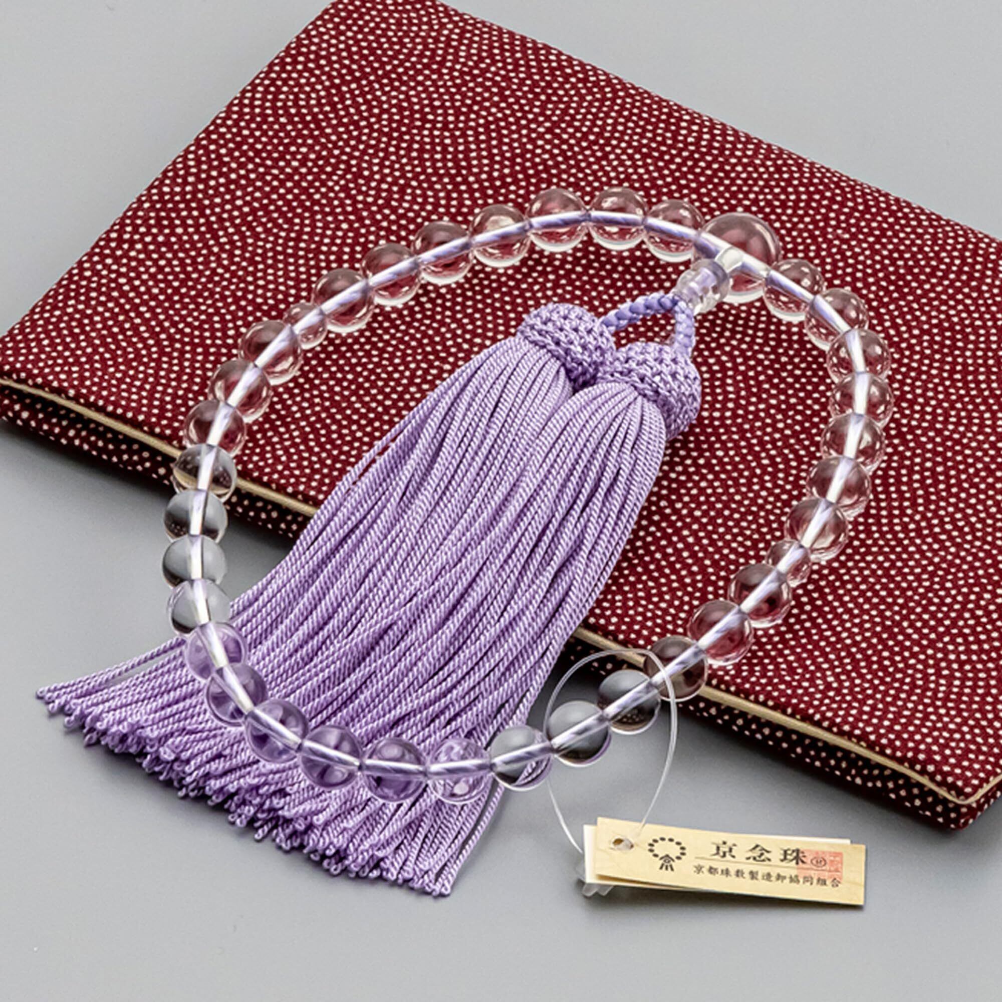 使用している玉は全て水晶。年齢問わずにご使用いただける美しい藤色の房は京都西陣で作られた正絹製。