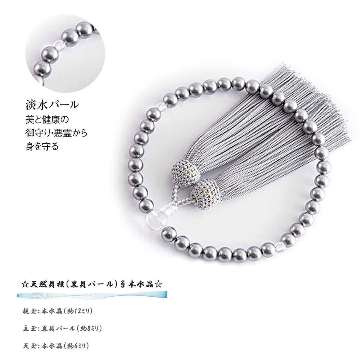 然貝を使用した黒貝パールの女性用お数珠です。本真珠の様な落ち着いた色合いで、持つ人をより上品な雰囲気に演出してくれます。 また葬式や法事などフォーマルの場で違和感なくお持ち頂けるお数珠です。