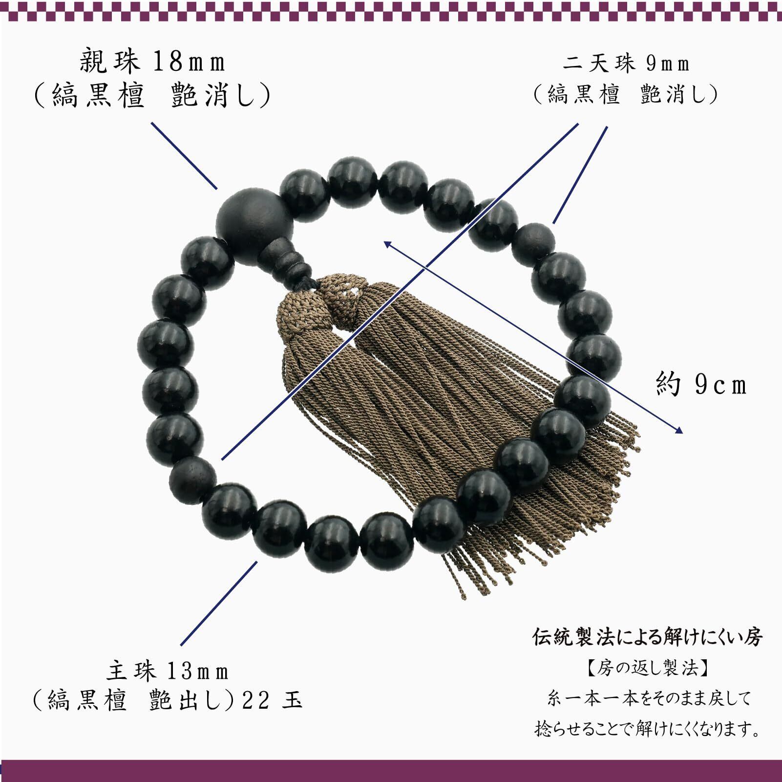 ️数珠職人の手で仕立てられた逸品であり、簡易数珠入れも付属しています。大切な数珠を保管する際に便利です。商品仕様は以下の通りです:縞黒檀(艶出し)22玉、主珠:縞黒檀(艶出し)13mm玉、親珠:縞黒檀(艶消し)18mm玉、天珠:縞黒檀(艶消し)9mm玉、房色:青丹、房の長さは約9cmです。