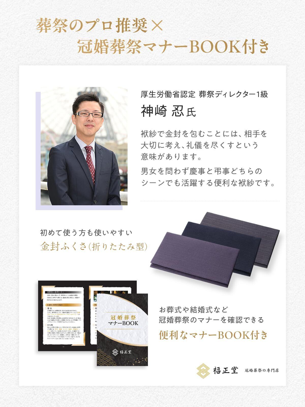 葬祭のプロも推奨 – 冠婚葬祭マナーBOOK付き 厚生労働省認定 葬祭ディレクター1級・神崎忍氏 推奨の袱紗。 「金封を袱紗で包むことは、相手を大切にし、礼儀を尽くす意味があります。」 初めての方でも安心して使えるよう、冠婚葬祭のマナーBOOKを付属。 正しい使い方を学びながら、しっかりと礼儀を尽くせる(初めてのふくさ)としてもおすすめの袱紗です。