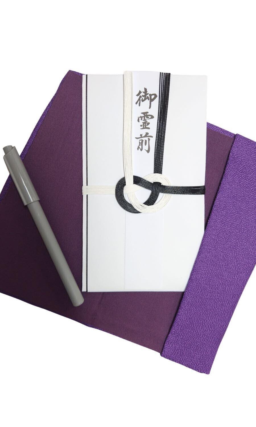 急なお葬式、法事や弔事に香典袋と薄墨筆ペンと袱紗のセットをご用意しました 書き損しても安心な短冊付きです お葬式では薄墨の筆ペンで記入することをお勧めします メーカーの在庫状況により商品の仕様が変わります 【香典袋】商品により水引の本数がかわる場合があります、また水引の色に銀色が入る商品もあります 【薄墨筆ペン】メーカーにより商品のロゴがかわります 【袱紗】メーカーの在庫状況によりデザインがかわりますが慶弔両用、男女兼用で使用できる商品です 袱紗の色は紫です