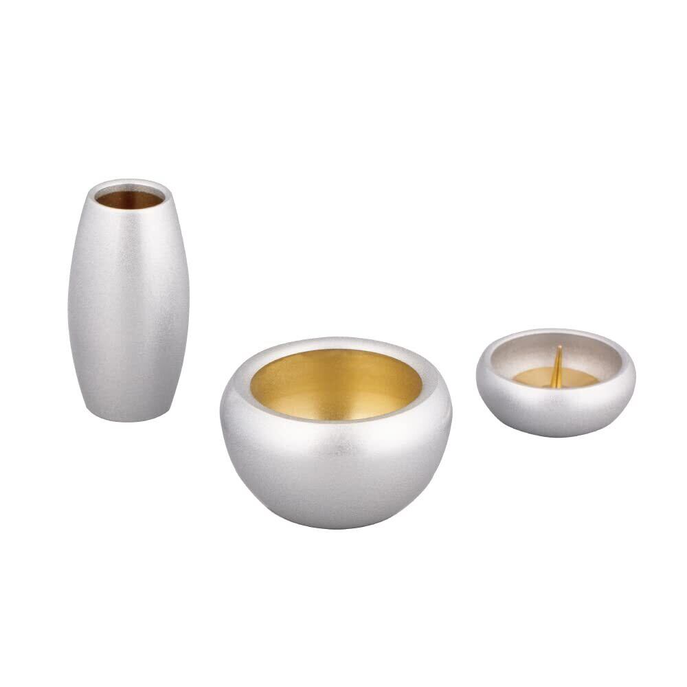 【3具足セット】仏具 セット シルマ 銀冠 シルバー 3具足 2.0寸 モダン仏具 銅製 真鍮 まあるい かわいい ミニ 仏具 (銀冠 シルバー) 香炉 花立 蝋燭立て 仏飯器 茶湯器 線香立て