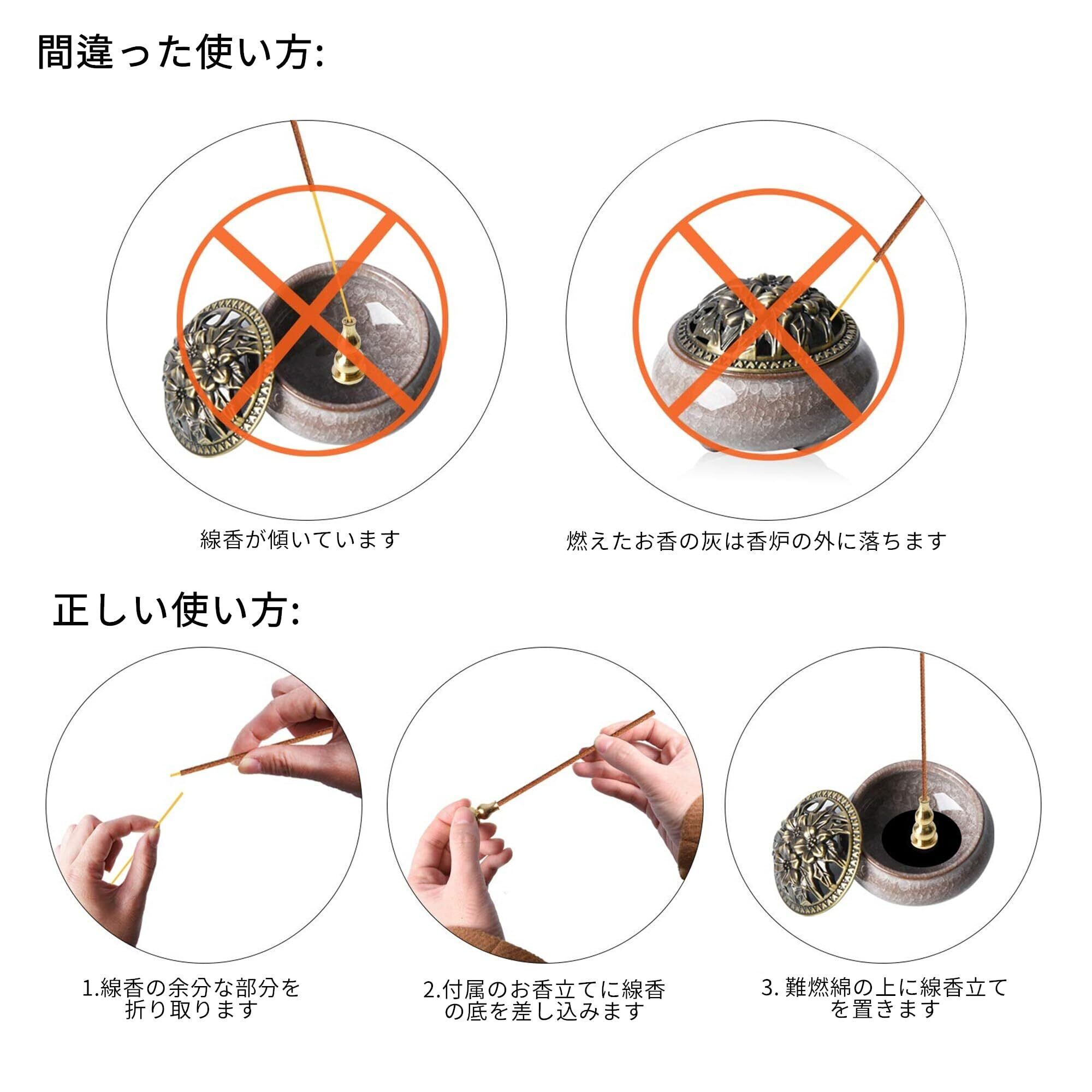 【機能性抜群】 ·本体は上質陶製で、上品で高級感と耐高温性が相まっています。 ·蓋付きなので深さもあり灰の舞い上がりもなく、風にも吹かれにくいので、エアコンや扇風機、窓のそばなど少し風を感じるような場所や屋外での使用も勧めます。 ·底部にある三つの足で安定感及び机との断熱があります。 ·亜鉛アルミニウム合金製香炉カバー落としても割れない。腐食に強く長期間使用が可能。経年変化を楽しめるのもメリットです。 ·防火綿のシート付で底に灰を敷かず手軽にお使い頂けます。 ·口も広く作られており、丸洗い出来てお手入れも簡単です。