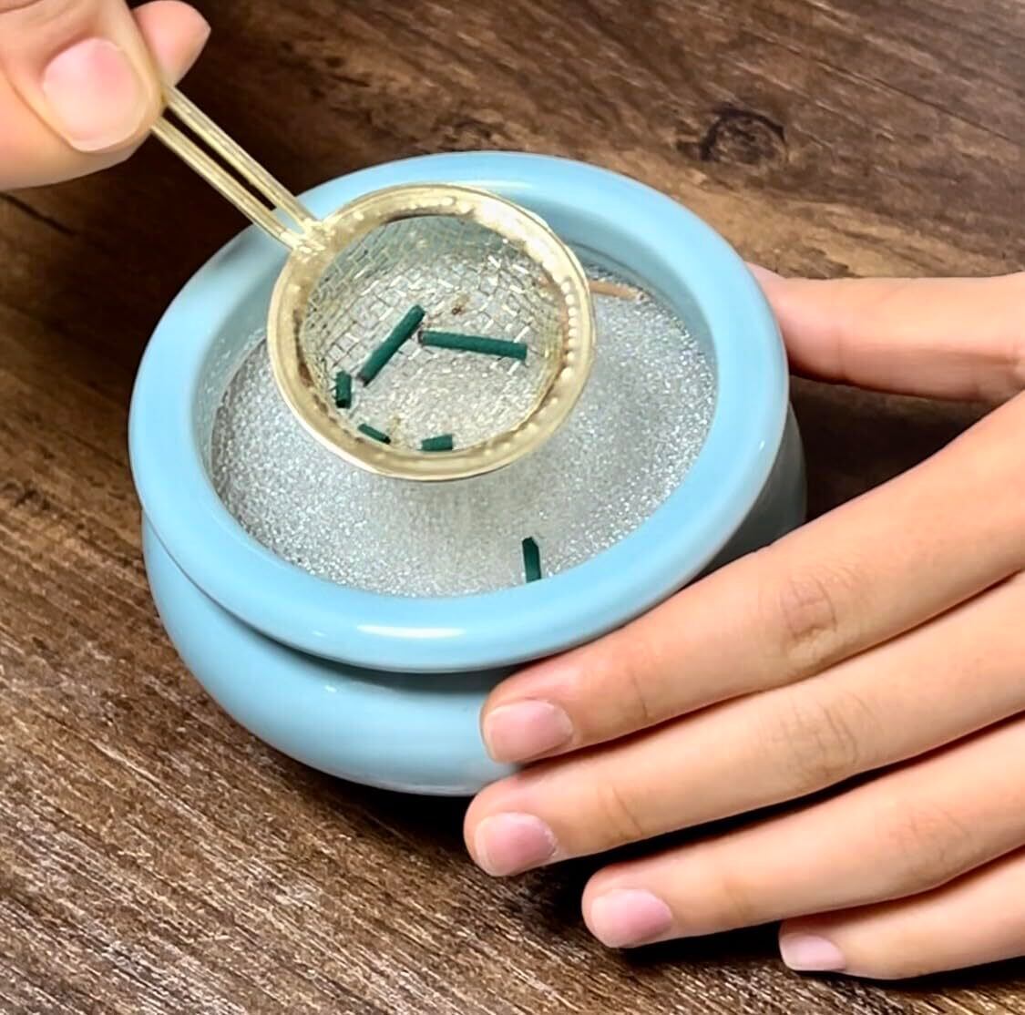 燃えかす取り網のメッシュはビーズだけふるい落とし、線香の燃えかすだけを濾します(線香の燃えた灰は濾し取れません)