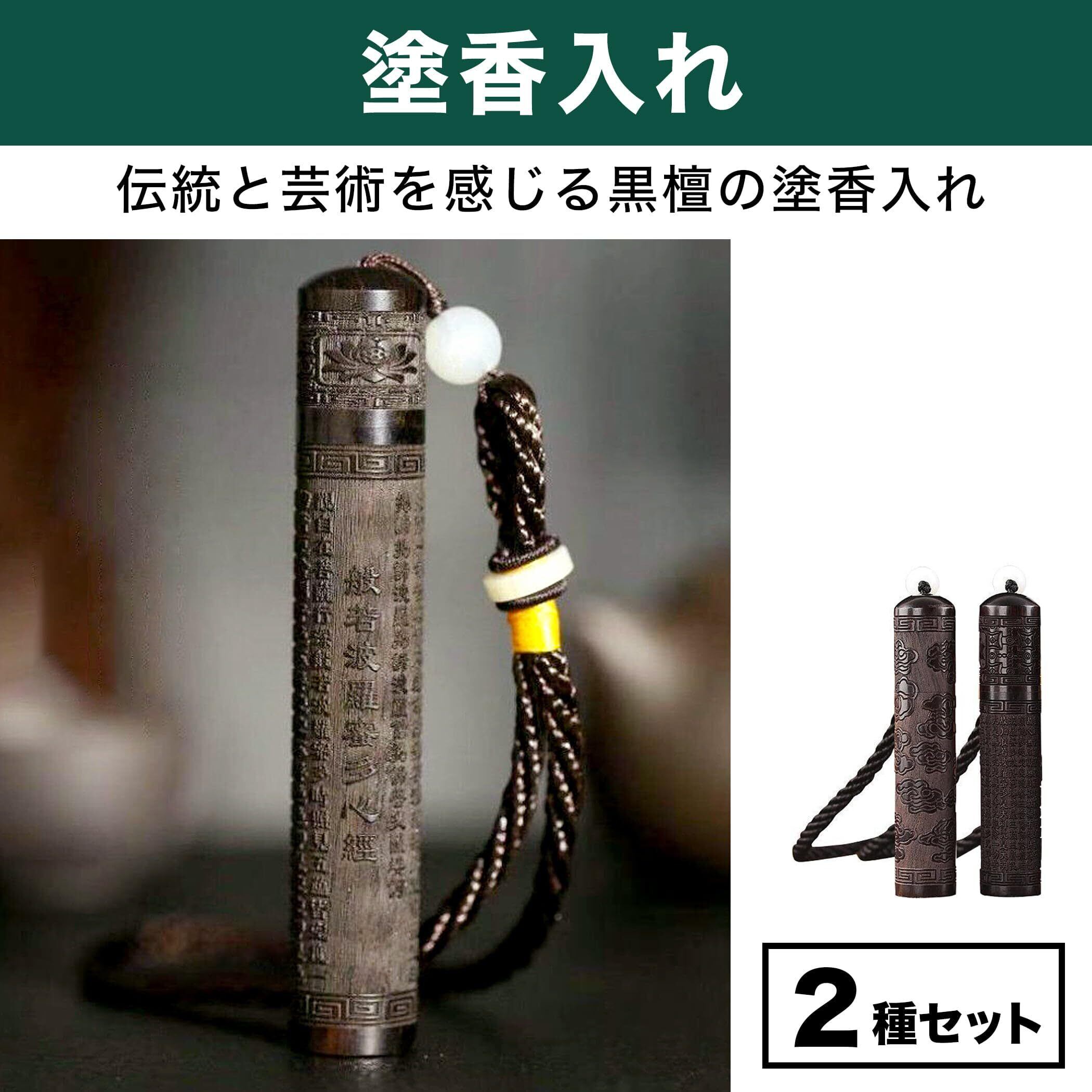 伝統と芸術を感じる塗香入れ:中国文化を象徴するデザインが施された黒檀の塗香入れです。吉祥の象徴である雲模様の彫刻と智慧や平穏を感じさせる般若心経の彫刻が美しく調和した2種セットです。細部にこだわった彫刻の技術が、視覚的にも触覚的にも魅力的な逸品です。