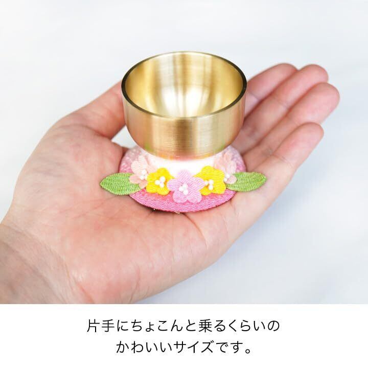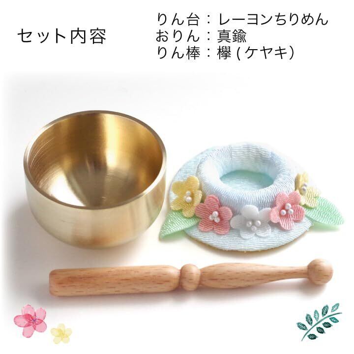ちりめん細工で出来たちいさなお花がとってもかわいい、ハンドメイドのおりん台とおりん、りん棒のセットです。ふんわりと優しい雰囲気です。手のひらサイズでコンパクトサイズ。
