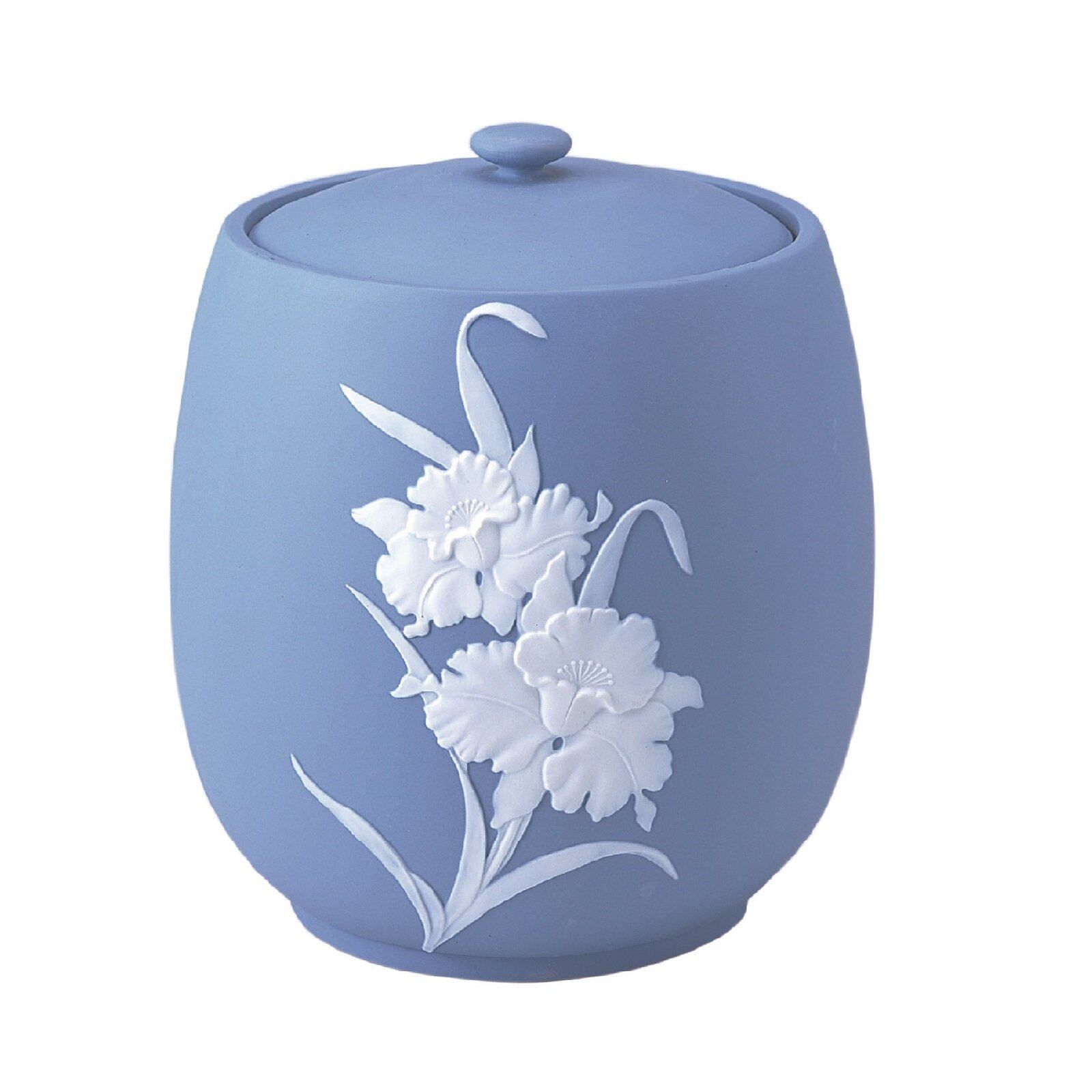 可愛らしいポット形のブルーの骨壺です。可憐なカトレアをカメオの技法で立体的に描かれた高級骨壺です。
