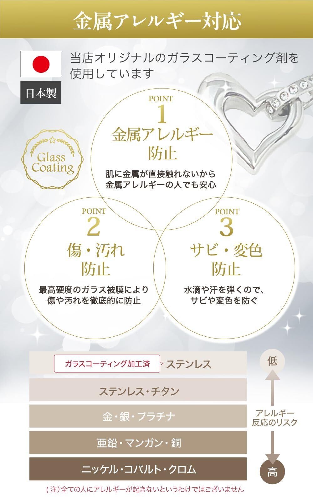【金属アレルギー 対応】本体、ジュエリーチェーン ともに 当店 オリジナル 日本製 の ガラスコーティング 剤を使用。 肌に 金属 が直接触れないので、 金属アレルギー や 敏感肌 の方でも安心。