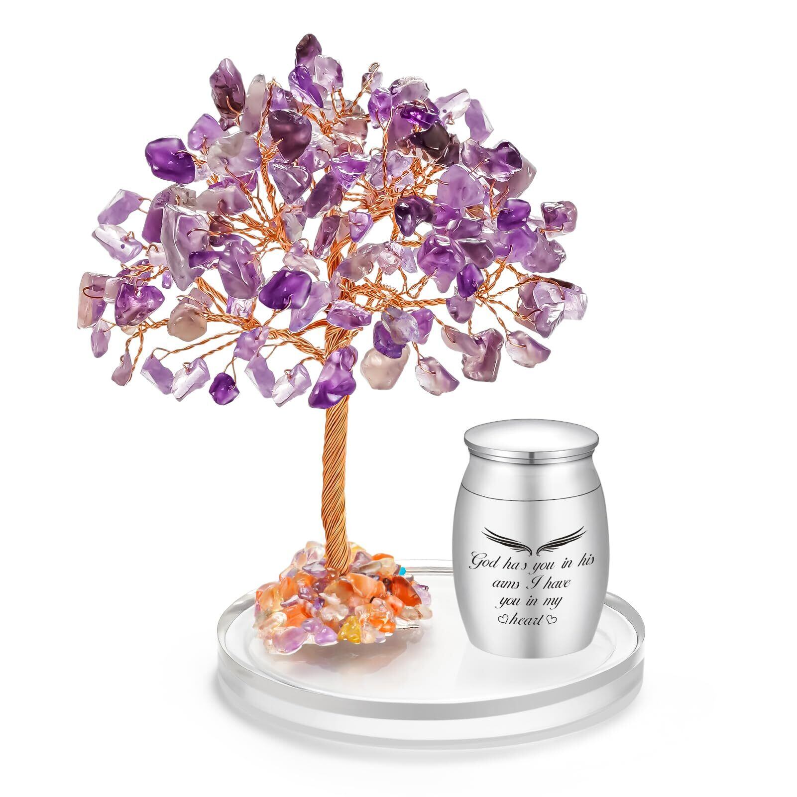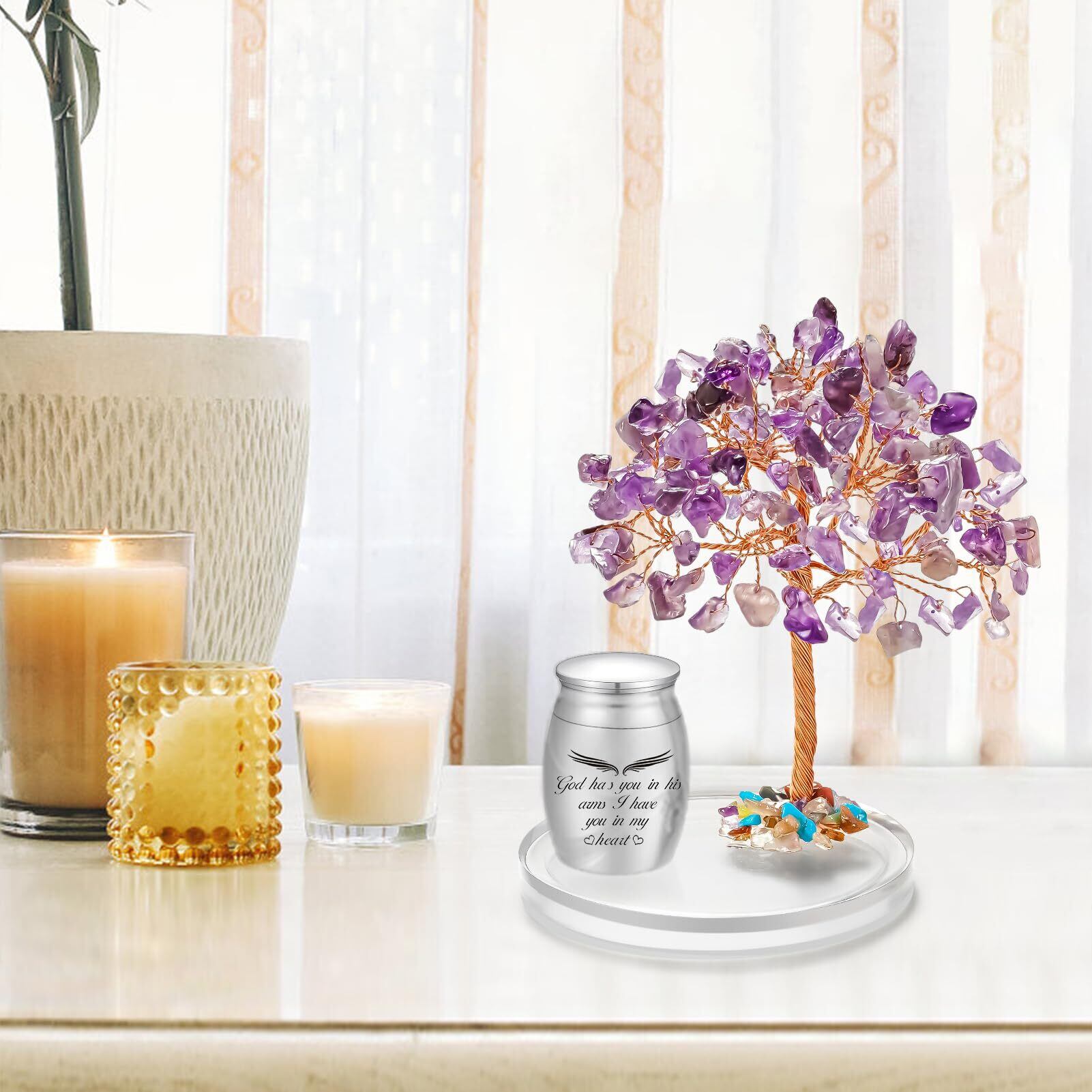 【愛と調和の象徴】-アメジストクリスタルと生命の樹は、愛、調和、幸運を象徴しています。本体に翼柄、「God has you in his arms I have you in my heart」があります。ミニ骨壷、お墓が遠くてなかなかお参りに行けない方、分骨して一部を手元に置いて、場所を取らず、ずっと置いておけます。この小ミニ骨壷は、故人の前向きな精神を称え、安らぎと調和をもたらします。