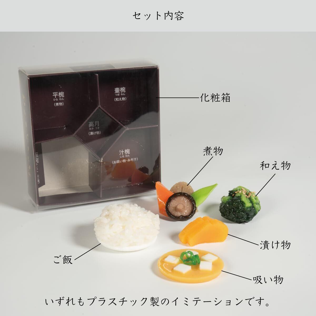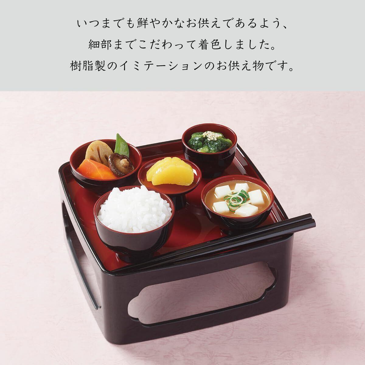 内訳/ご飯、吸い物、おかず、和え物、漬物 各1 材質/PVC製 ※お供え料理セットはイミテーションです。食べることはできません。 ※仏膳はついておりません。