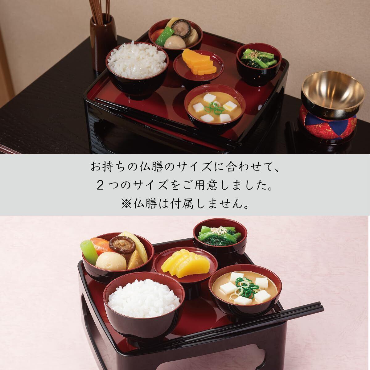 各パーツは別々にご使用になれます。おかずや汁物など、手作りのお供えものをそこだけ使いたい時や、仏器でご飯だけをお供えしたいときや、略式仏膳でご飯、汁物、おかずのみをお供えしたいときにもご使用になれます。