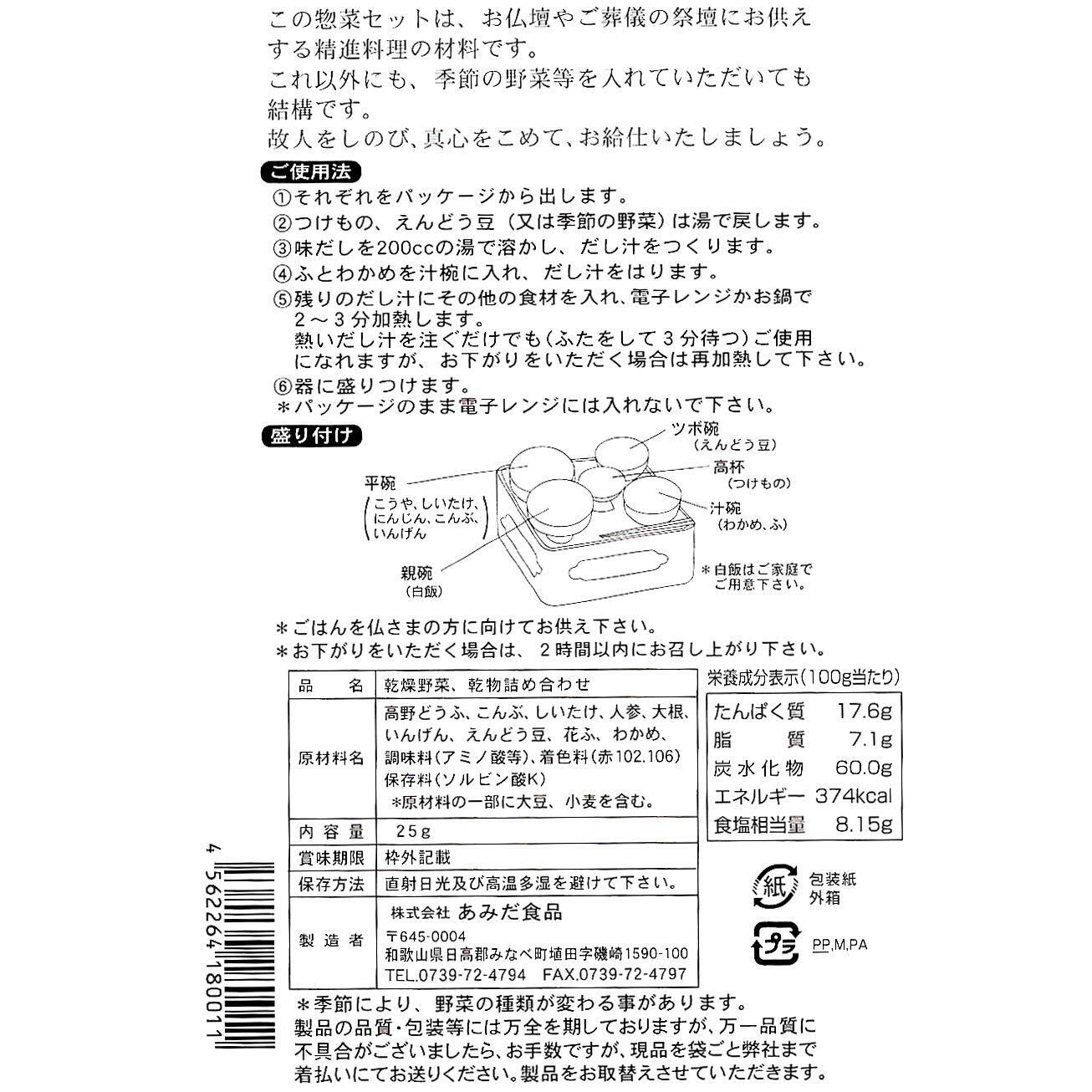 お仏壇やご葬儀の祭壇にお供えする 精進料理が簡単にできる素材セット「ご先祖さま」 素材以外にも季節の野菜等を入れていただいても結構です。故人を偲び、真心をこめて お給仕いたしましょう。 御飯以外の具材が全てそろっています。だしも入っているのでとても簡単に作れます。 ※御飯はこちらの素材には含まれておりません