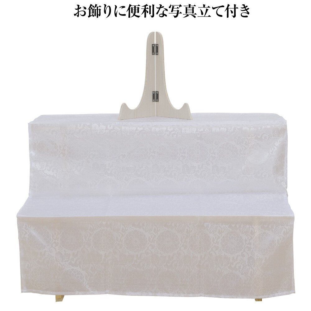 寸法:巾84cm×高さ52cm×奥行55cm/細部寸法:1段目高さ27cm、2段目高さ25cm、1段目奥行27cm、2段目奥行27cm/重さ:約3kg/材質:木製/備考:組み立て式(説明書付)、白布付き、写真立て付き(高さ29.5cm)