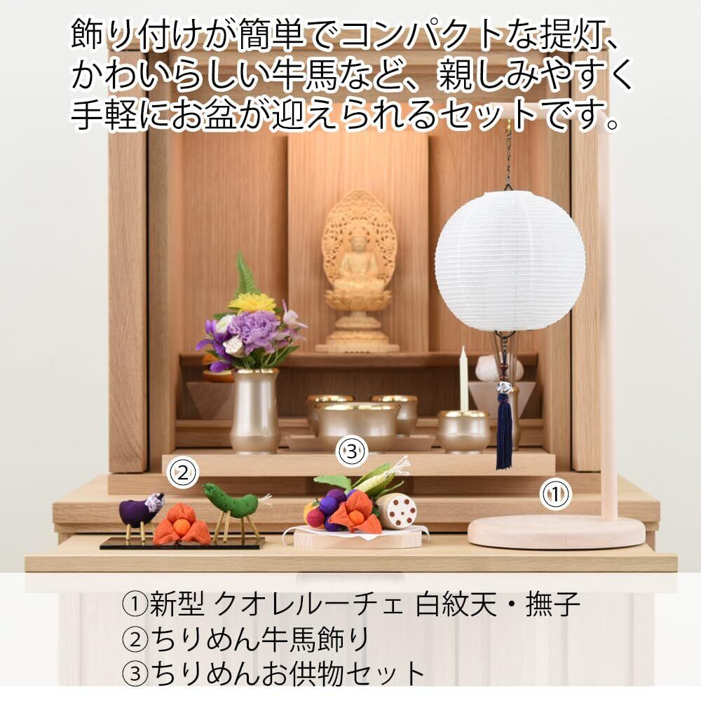 【商品詳細】セット内容:①クオレルーチェ 白紋天・撫子、②ちりめん 牛馬飾り(台付)、③ちりめん お供物セット(台付) / 各商品サイズ:画像をご確認ください。