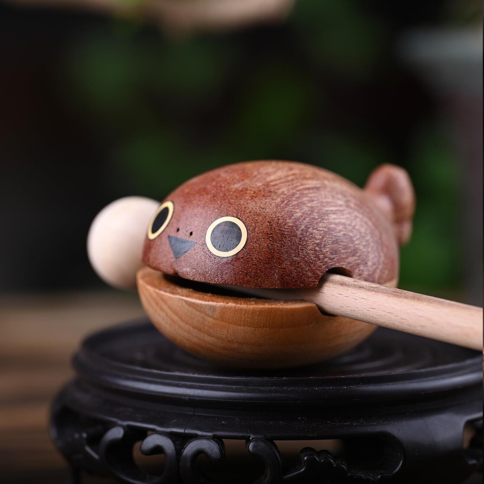 子供から大人まで楽しめる癒しの楽器としても楽しめます。 付属の棒(バチ)で叩くと、心地よい木魚の音が響きます。 木魚をのせる座布団やぬいぐるみと一緒に飾ったり、おままごとやごっこ遊びの道具としても活躍。 アートなオブジェとしても彩りを加えます。