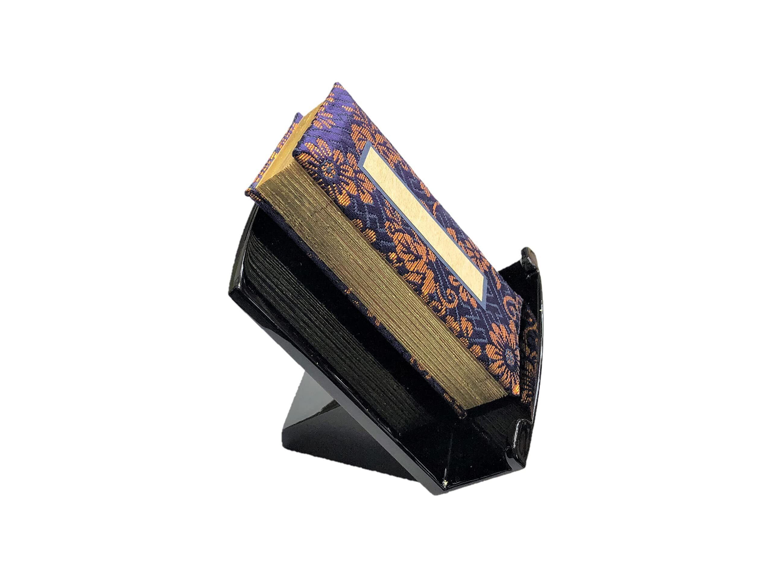 光沢の美しい台と過去帳のセットです。過去帳を開いた状態で置けますよう両脇で押さえる構造になっております。 木製黒塗の過去帳台です。プラスチックではありません。フチ金粉仕上げ。過去帳は紺の上金襴に中紙鳥の子和紙製、日入りの一般的な普及品です。御宗派問わずお使いいただけます。