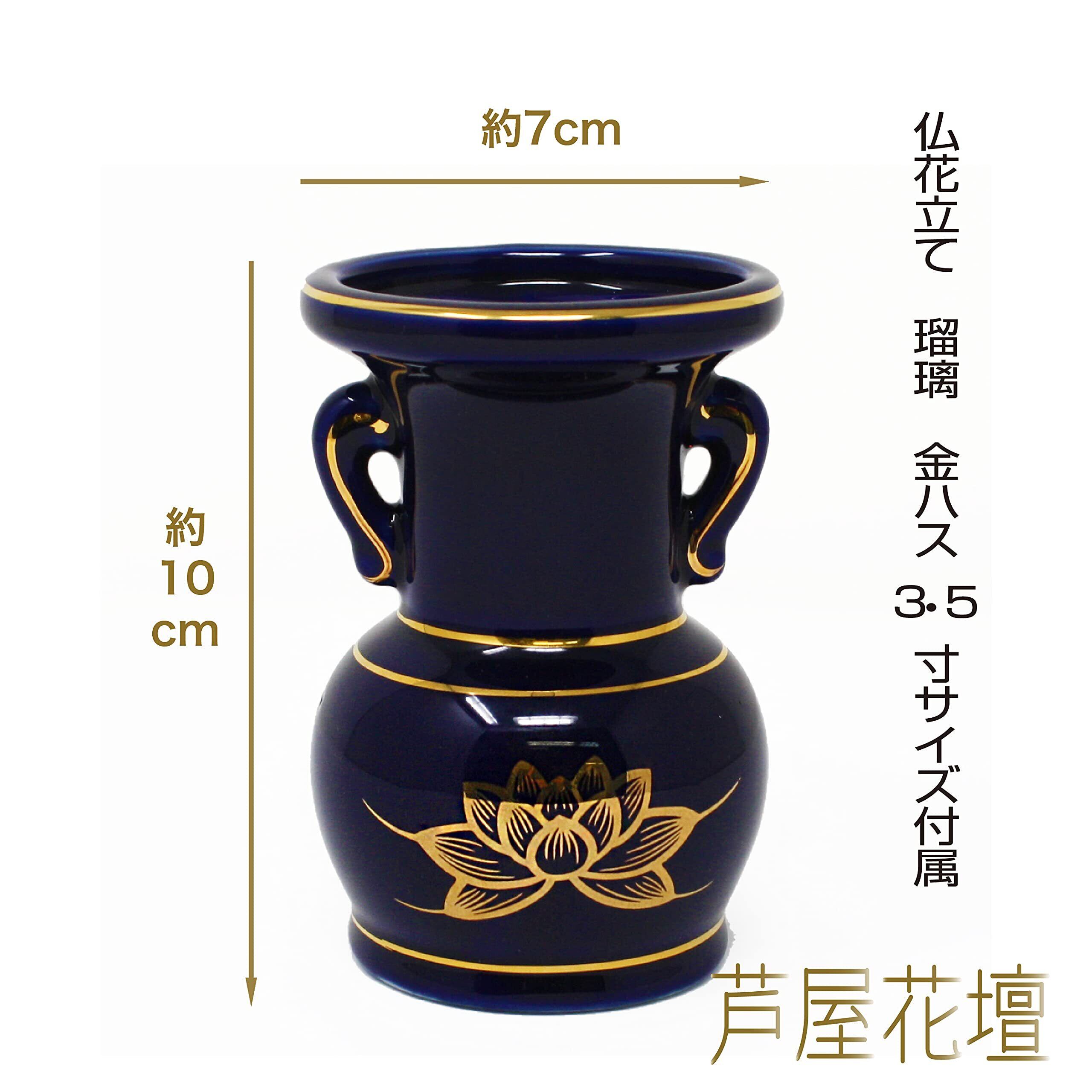 A&K 仏具 仏花立て 2点セット (一対/瑠璃金 ハス/紺) 仏壇用 花器 花瓶 お供え (直径7×高さ10.5cm) 花立て 3.5寸 陶磁器 お盆 彼岸 お悔み