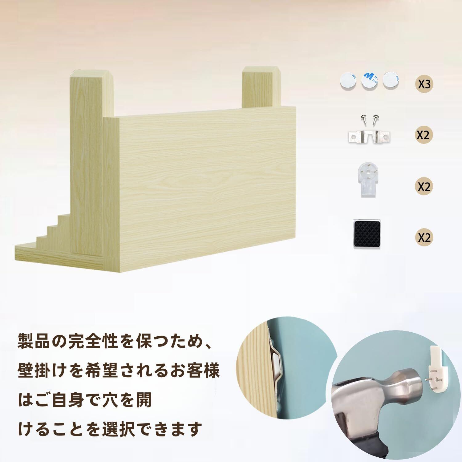 簡単な取り付けと設置:当社の製品は取り付けが簡単で、例えば壁掛け用のフレームや直接設置するタイプがあります。賃貸住宅でもご使用いただけます。お客様の快適なライフスタイルをサポートいたします。さらに、ご購入いただいた神棚には、無料で云板1枚、ダブル面隠しテープ3枚、隠し釘2本。