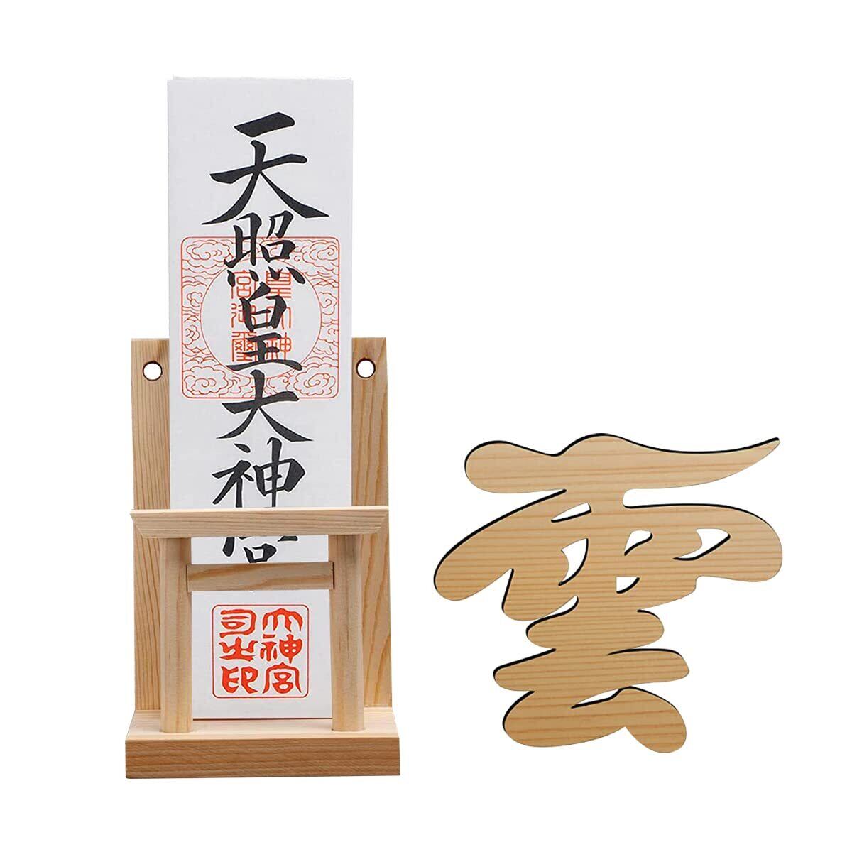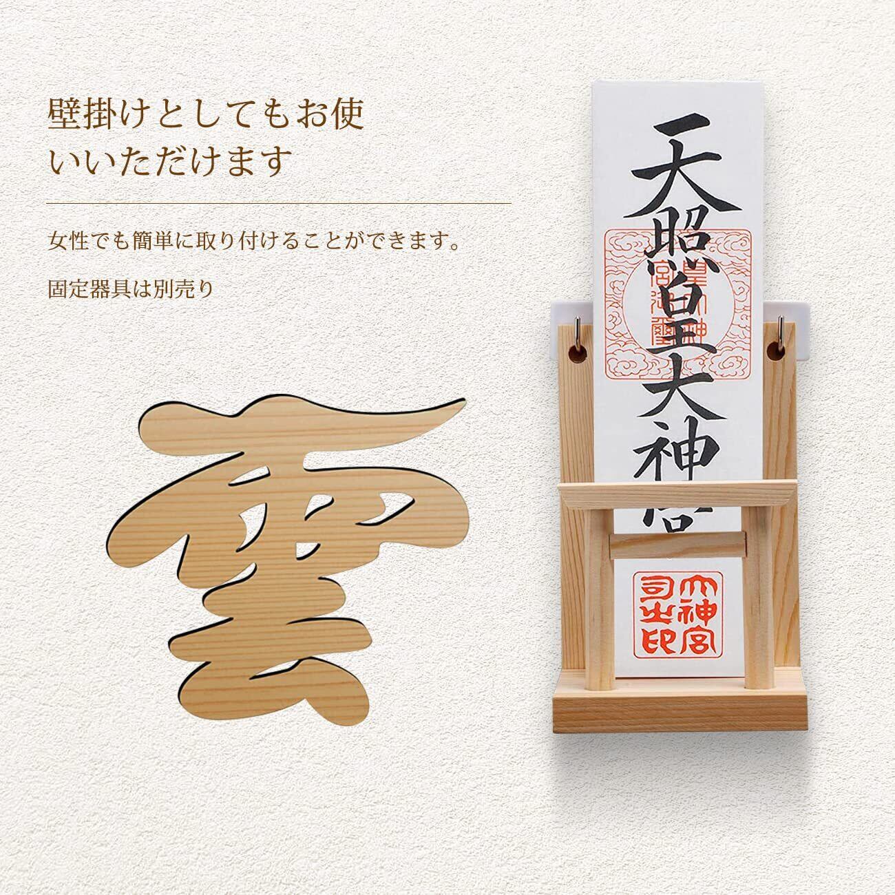 【お札立て&雲】お札立ての中央には白松の鳥居、神社のような神聖な雰囲気たっぷりです。俗世と神の域を分ける鳥居の向こうに、お神札をきれいに並べます。神社やお寺から授与された御札を大切にお祀りします。朱印帳立てとしてもご利用いただけます。雲板は神棚や御札立てと合わせて使用することでその場所を浄化することができます。大切なご神体や御札を正しい作法でお祀りできます
