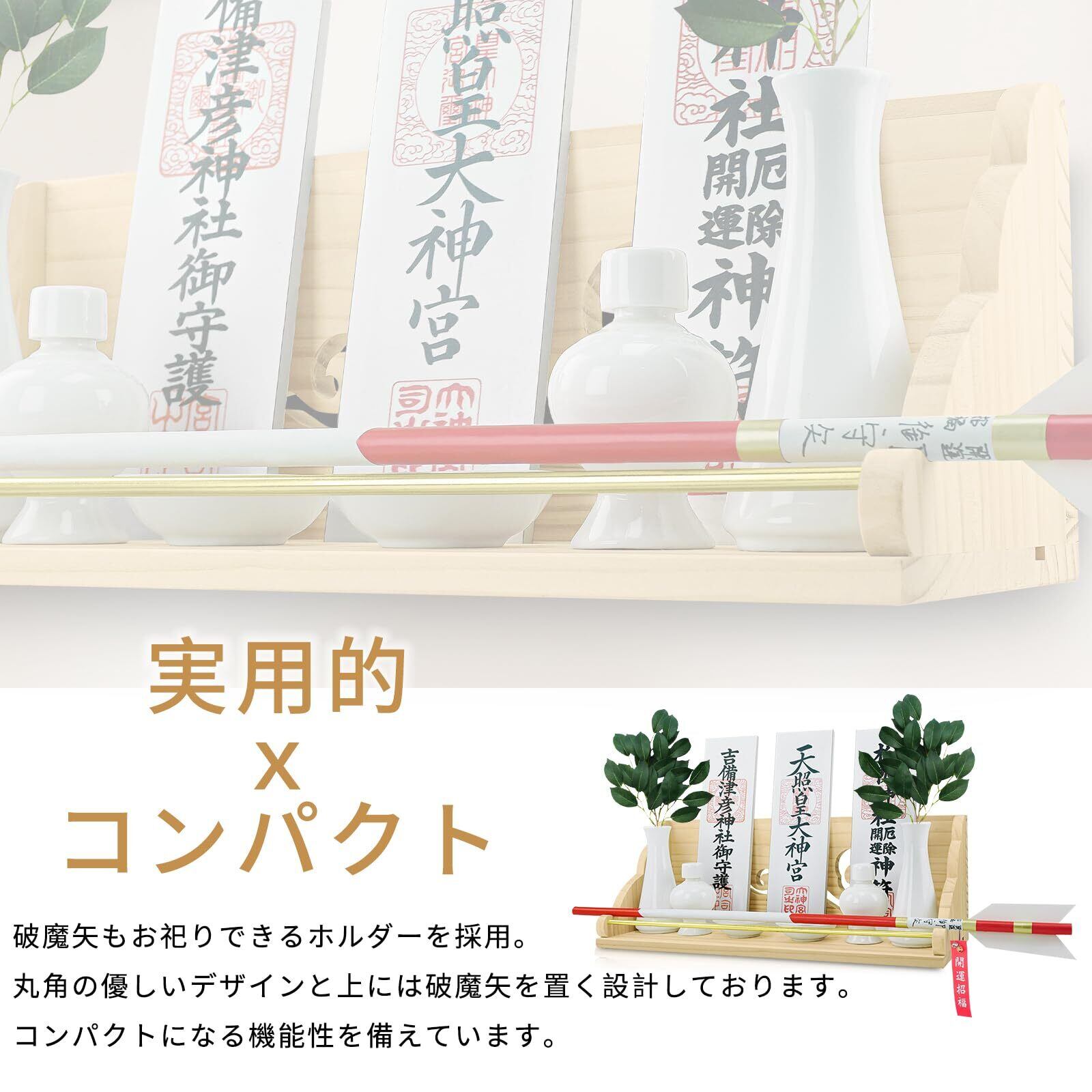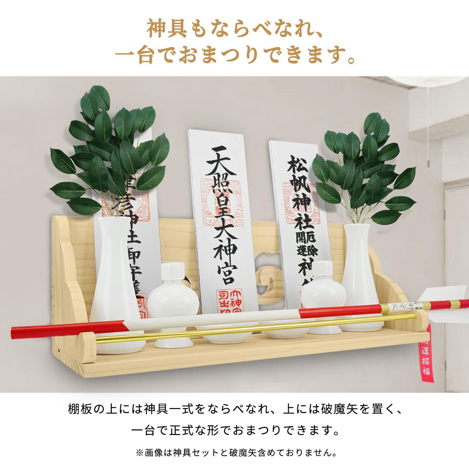 【たっぷり収納できる大型神棚と安心の】神棚のサイズは幅42×奥行15×高さ15cmで、様々な御神具(榊立て、破魔矢、御札、お守り、御朱印帳など)をまとめてお祀りいただけます。※ 万一何らかの不備がございましたら、何時でもお気軽にご連絡ください。無料交換や返品・返金対応させていただきます。