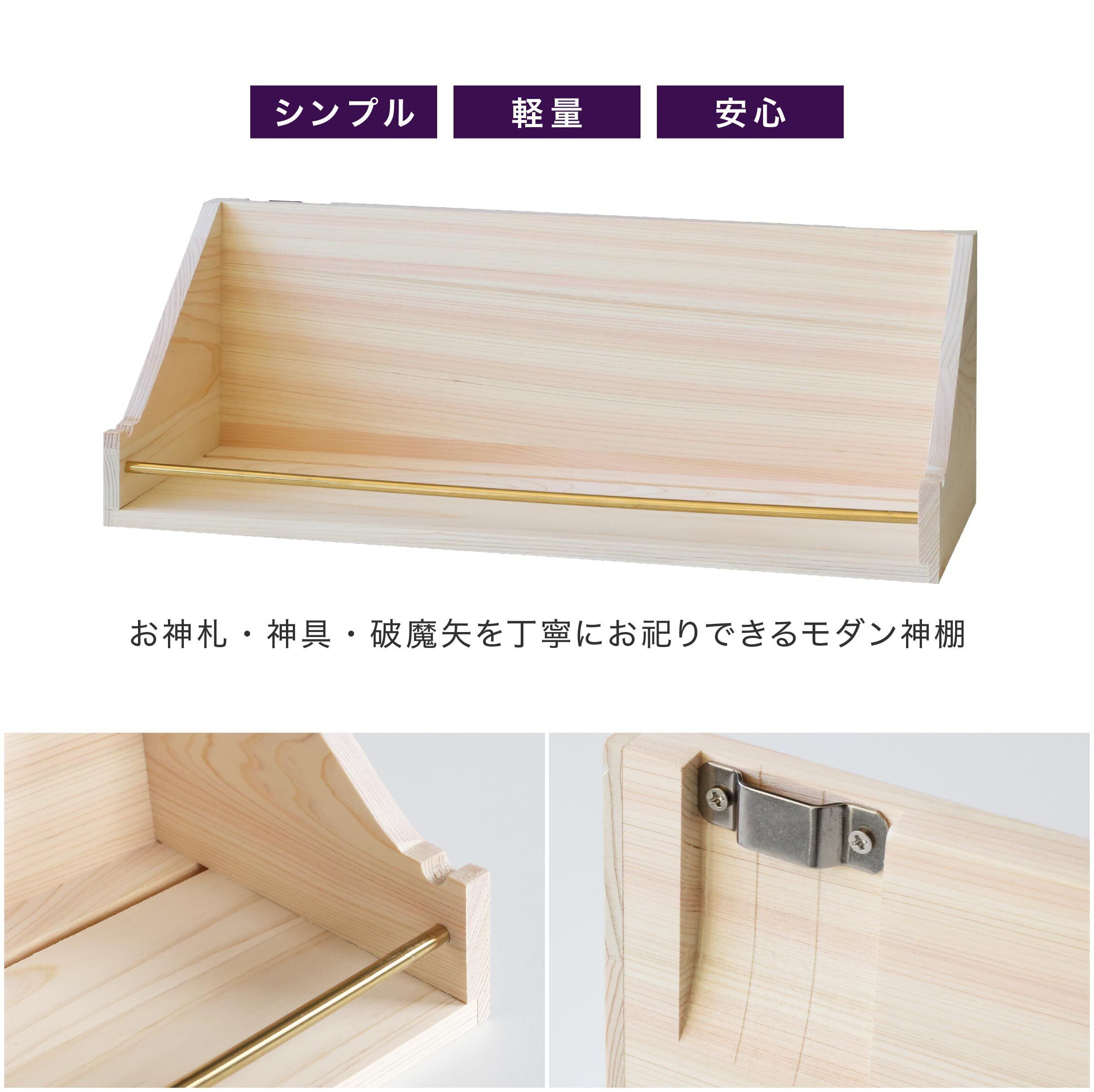 お神札の滑り落ちを防ぐストッパー(溝)が引いてあり、単品でお神札や破魔矢のお飾りができます。 袖付など小型の神棚を乗せれば神棚板としても使うことができ、用途や状況によって自由に使い方を変えることができる便利な神棚です。