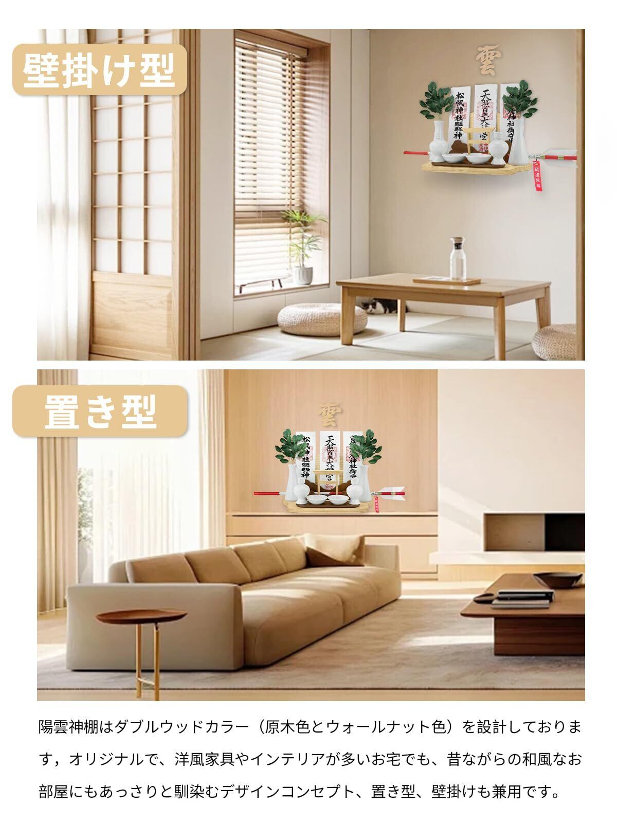 【モダンなデザイン神棚|日の出と光と雲の調和】朝陽昇る雲海をイメージしたモダンな神棚「陽雲」。温もりある天然木(原木色とウォールナット色)サイズ:(幅34×奥行20×高さ18.5cm)の美しい木目と落ち着いたダブル色合いが、洋風・和風問わずお住まいに調和します。前面の厳かな鳥居が神聖な空間を演出し、神宮大麻(三社札)の奉納にも対応。※万が一不良品がございましたら、迅速に対応いたします。