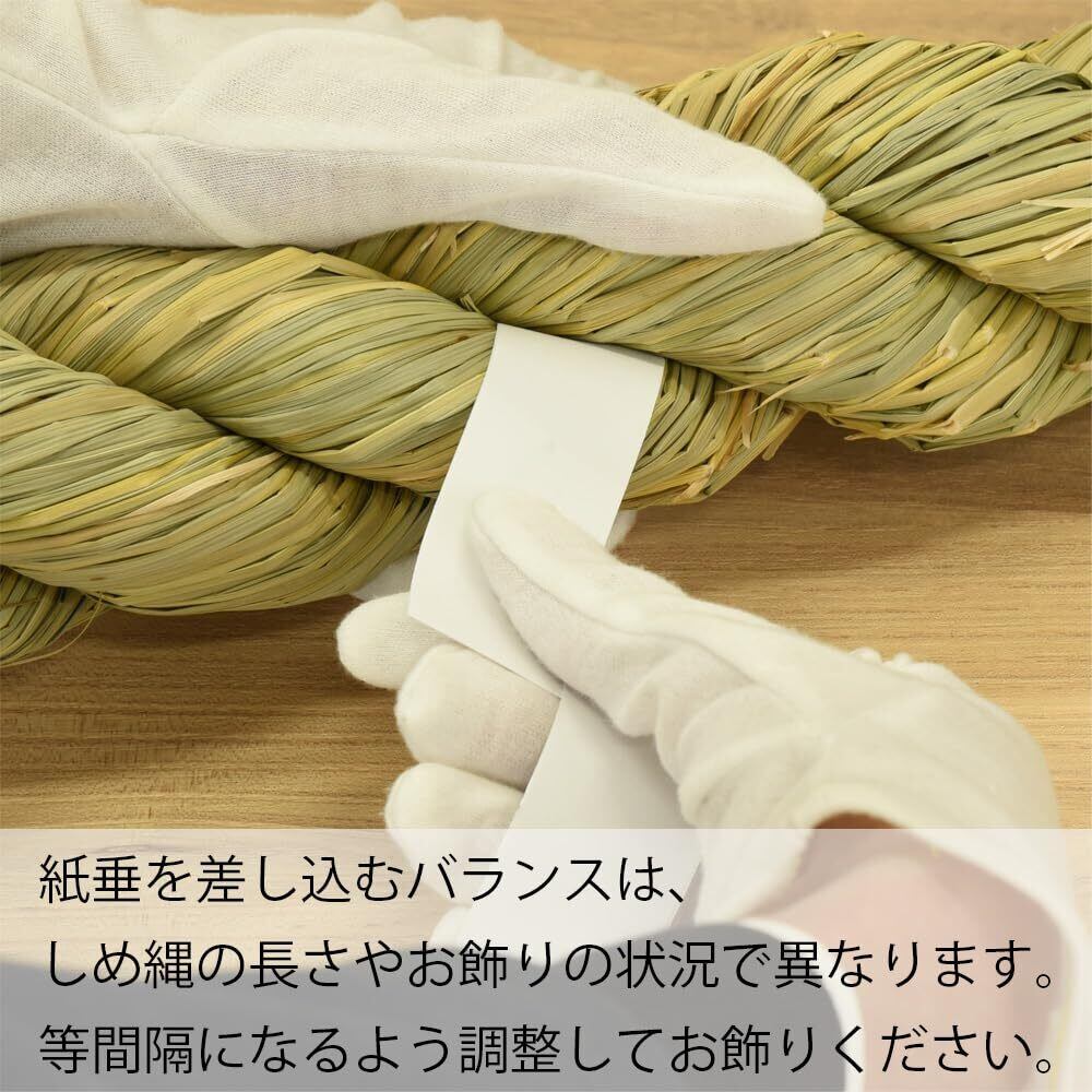 【しめ縄の飾り方】しめ縄の向きは、太い部分が向かって右側に来るようにするのが一般的とされていますが、出雲大社は太い部分を左側にして飾るなど、地域によって違いがございます。また、白タレ(紙垂)と呼ばれる紙片を挟み込みます。白タレ(紙垂)の意味は諸説あり、しめ縄と同じく清浄で神聖な場を示すためのものという説や、豊作をもたらす雷(稲妻・稲光)をあらわしたものという説があります。※古来では、雷が多い時期に稲が実りやすいことから、雷と豊作を結びつけて考えていました。