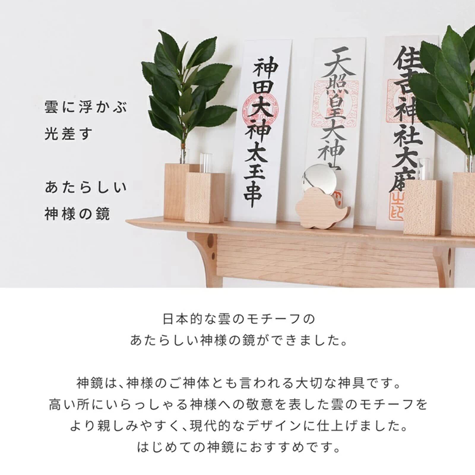 高い所にいらっしゃる神様への敬意を表した雲のモチーフを より親しみやすく、現代的なデザインに仕上げました。 はじめての神鏡におすすめです。