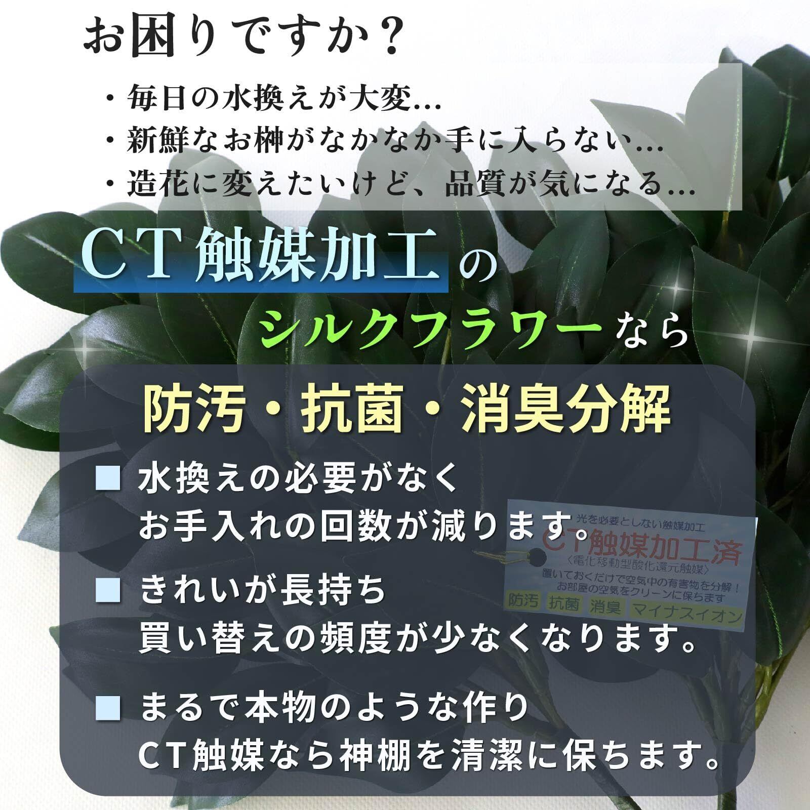 ✨【シルクフラワー加工に加えて、CT触媒による消臭分解・防汚作用が施されています!】そのため、美しい緑の葉が長期間美しさを保ちながら、神棚を引き立てる存在となります。