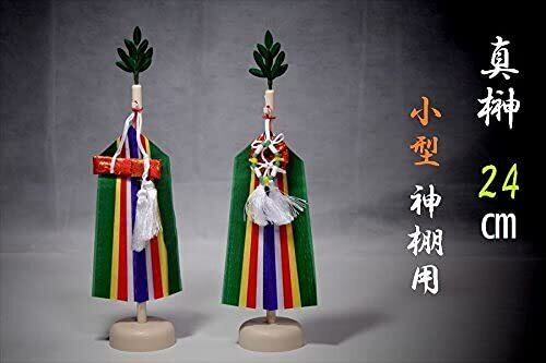 国産、手作りの美しい「真榊」。小型の神棚に合う、高さ24cmサイズとなります。神棚周りの神具としてはとても人気のある装飾品です。真榊は神様の領域をあらわす神具、また神事の場では祭壇の左右に立てられる祭具としても有名です。 榊の葉の部分には生絹を使用しております。三種の神器である、鏡、勾玉、剣が小さいながらも精巧に再現されています。神宝を象り浄明・智徳・勇気をお祈りすることができます。