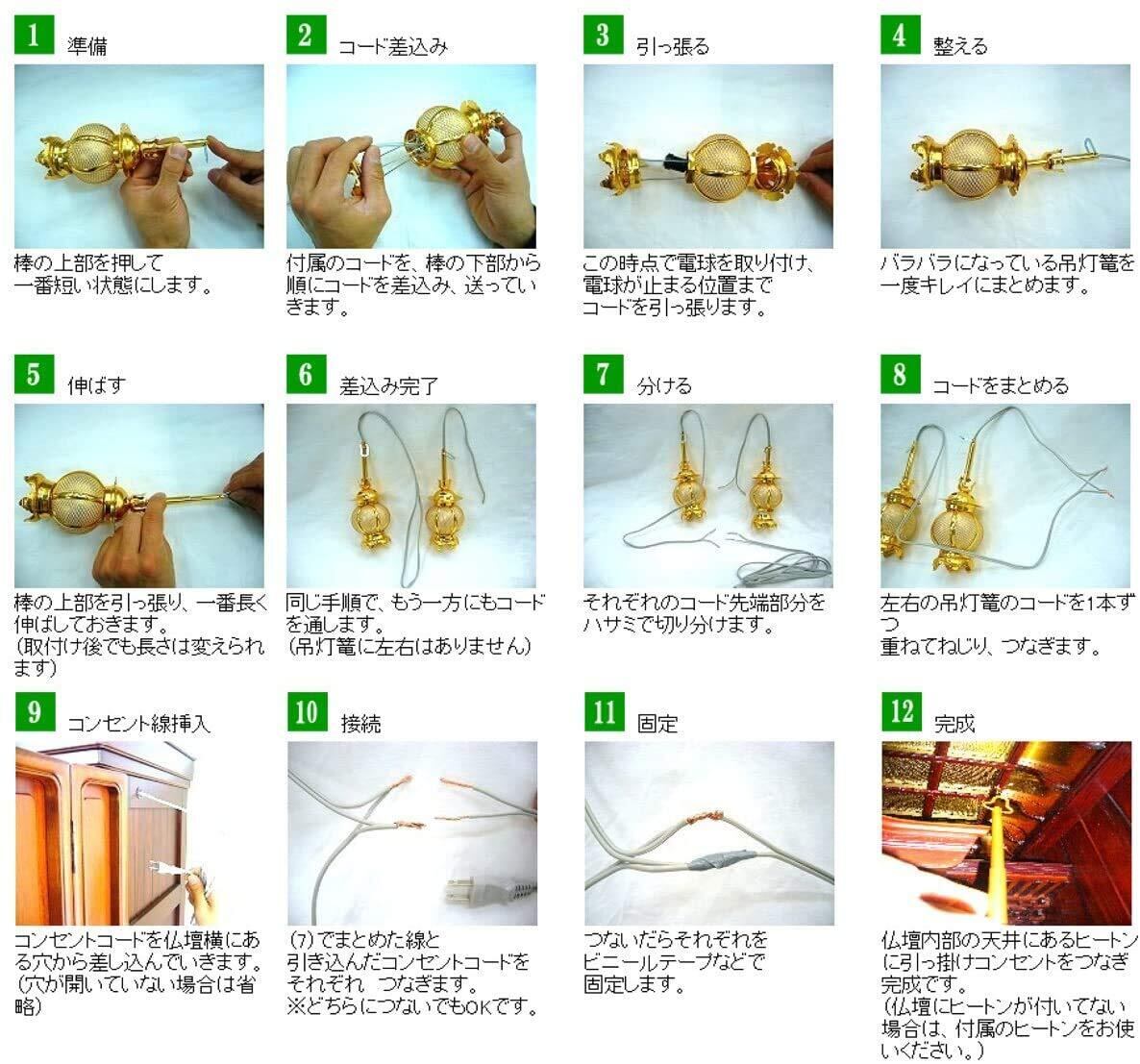 詳細 100Vの専用白熱電球2個付き、吊灯篭コード 他社製品でも取り付け可能ですが、一部取付できない商品もございます。(吊り棒が空洞の場合はほとんどの商品に取り付け可能です) 神前灯篭にも対応。 お仏壇の壁(横上)に開いている穴を通せるように線同士は繋いでおりませんので、接続取扱書を同封致しますので接続をお願いします。 サイズ コードの長さ約2.5m 足りない場合は延長コードなどで追加して下さい。