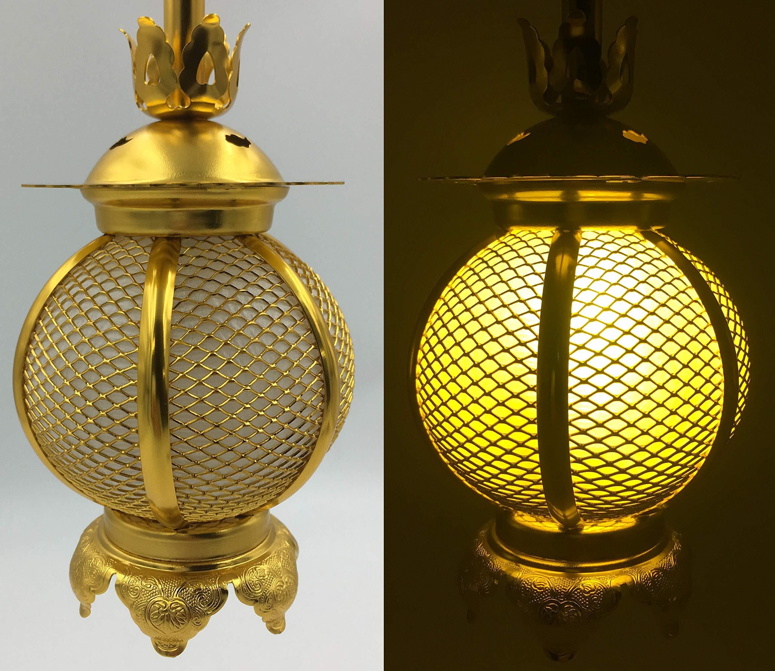 吊り灯篭は仏壇の天井から吊り下げる灯篭で、隠元灯篭とも呼ばれます。吊灯篭はご本尊や位牌を照らし、仏壇の中を明るくします。