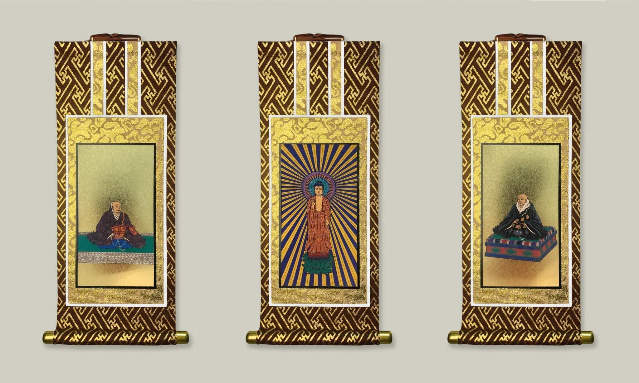 お仏壇にお祀り致します浄土真宗本願寺派(西本願寺)用の掛軸です。阿弥陀如来(中央) 親鸞聖人(向かって右側) 蓮如上人(向かって左側)。