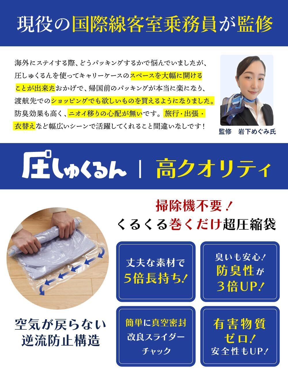【旅行のプロ監修 衣類圧縮袋】 旅行のプロである現役客室乗務員 岩下めぐみ氏監修 旅行用衣類圧縮袋[圧しゅくるん]になります。 ※登録済み。