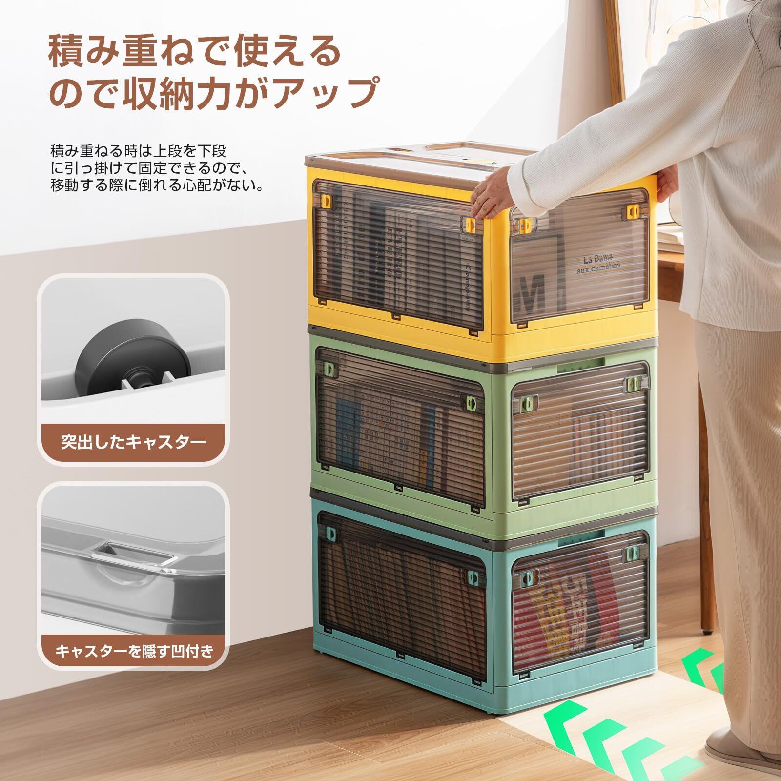 収納ボックス 折り畳み 蓋付き 全方向から取り出せる キャスター付き 折り畳み コンテナ ボックス 衣装ケース 押し入れ 収納ケース おもちゃ 小物 洋服 布団 本 漫画 収納箱 収納用品 家庭用 オフィス用 車用 おしゃれ 組立簡単 大容量 防塵 防カビ 防湿 無臭 厚み 強い耐荷重(Sサイズ1個:40.5*29*24cm)