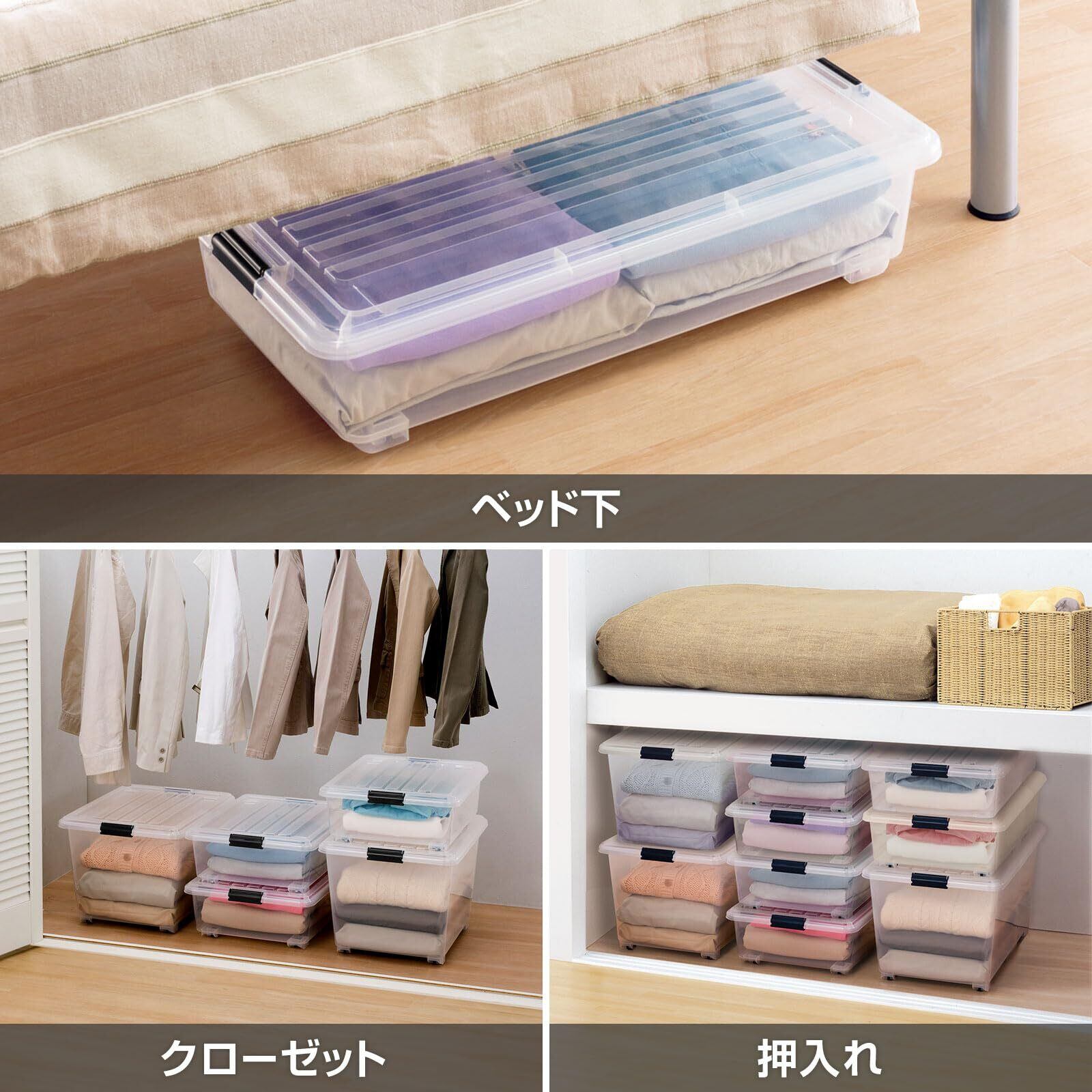 押入れの収納に最適なフタ式収納ケースです。中身が一目で分かるクリアタイプ。移動に便利なコロ付きです。