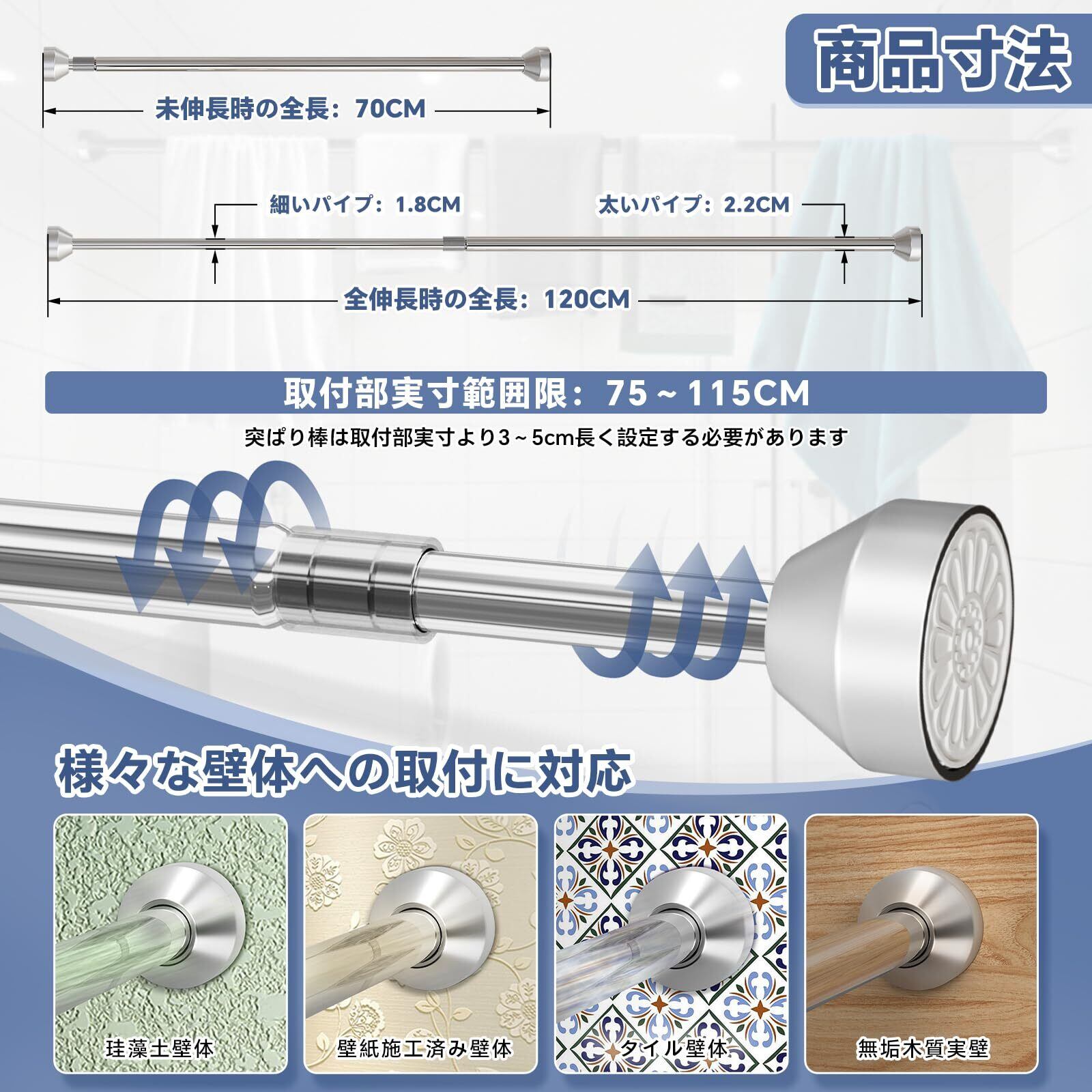 【広めの収納をすっきりカバー】75~115cmの設置幅に対応し、広めのクローゼットや洗面所、玄関など、やや広いスペースの収納をすっきりと整理。この強力つっぱり棒はスッキリとした美しい空間づくりを実現します。