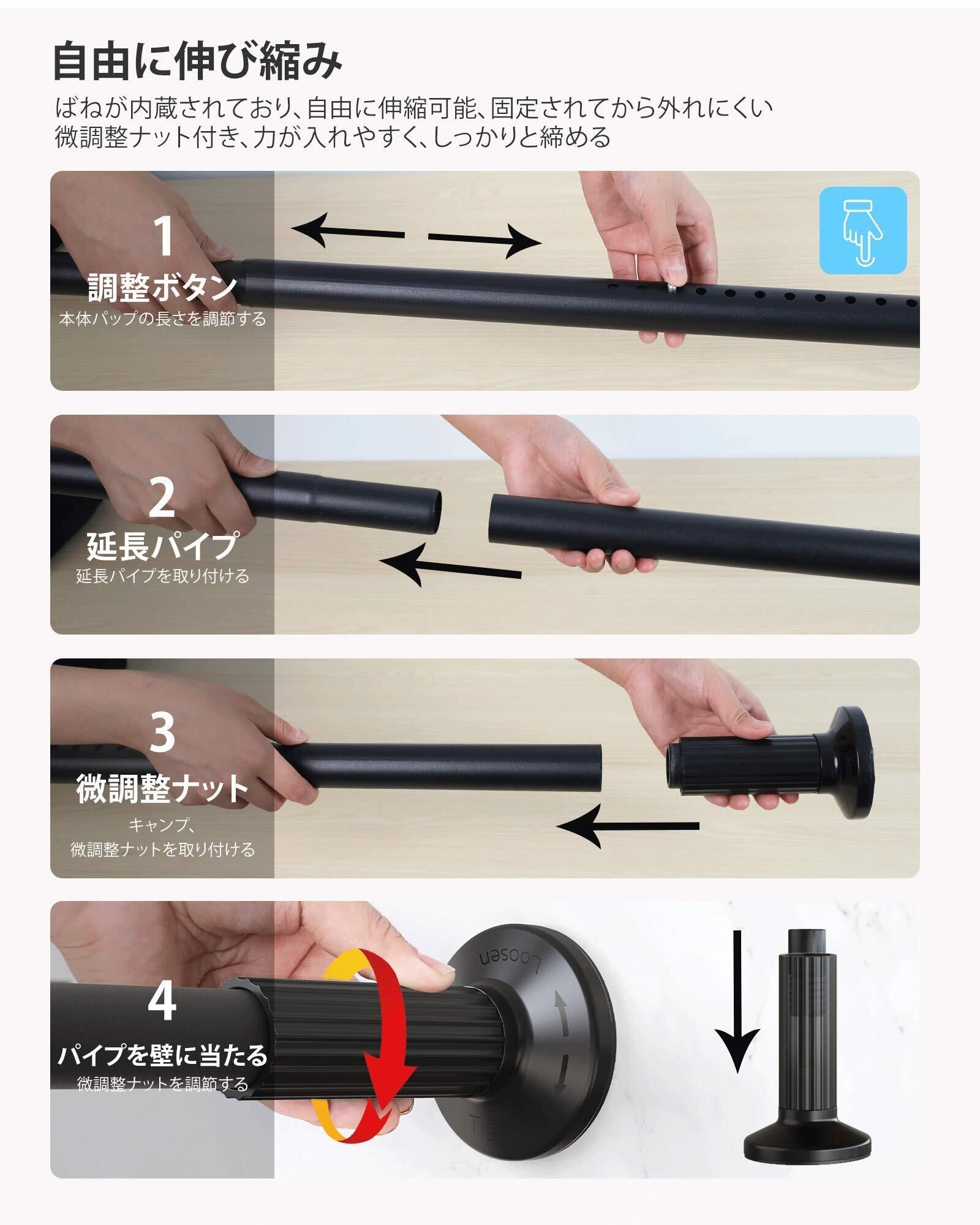 【耐荷重抜群】つっぱり棒は炭素鋼製で、強い負荷に耐えられます。强力ばねを内蔵して、長く伸ばしてもずれ落ちる心配がないです。接着面が滑り止めゴムを採用するので、摩擦力が增えます。