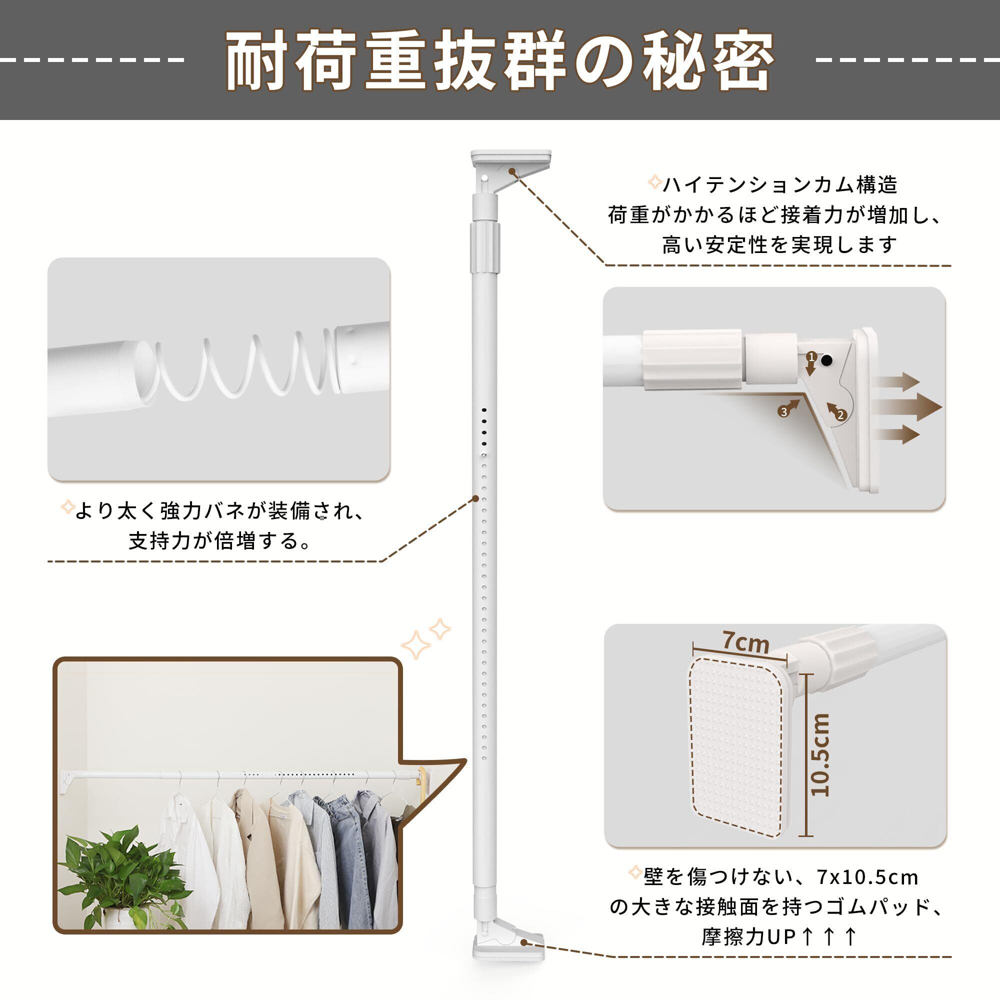 【優れた耐荷重性能】炭素鋼製のつっぱり棒は強い負荷に耐えられる設計です。内蔵された強力バネにより、長く伸ばしてもずれ落ちる心配がありません。接着面には7x10.5cmサイズのハイテンションゴムを採用しており、摩擦力が高まります。