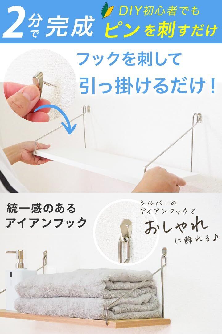 【実用性抜群の奥行き20cmタイプ新登場!賃貸でも安心のウォールシェルフ】 当店オリジナルの実用的なウォールシェルフセットが、さらに使いやすくなって新登場しました。賃貸住宅にお住まいの方も、持ち家の方も、誰もが簡単に取り付けられる壁掛け棚として大好評です。新しい奥行き20cmタイプは、日常生活での使いやすさを追求した、まさに「暮らしの救世主」とも言えるウォールシェルフです。 【賃貸でも安心!壁を傷つけにくい取り付け方法】 賃貸住宅では壁に穴を開けることを躊躇する方も多いですが、このウォールシェルフなら安心です。 取付はとても簡単。フックを壁に刺して引っ掛けるだけ。わずか2分で完了です。フックが刺さりにくい場合もご安心ください。付属のミニハンマーでかる~く叩けばキレイに刺すことができます。女性の方でもラクラクです。 また、賃貸物件でも気軽に使用できる、壁に優しい設計になっています。取り付け後も小さな針穴(画鋲くらい)が空くだけなので、引っ越し時の原状回復も簡単。賃貸生活者の強い味方となる壁掛け棚です。 【実用性を重視した奥行き20cmの棚】 従来の15cmタイプよりも奥行きが増えたことで、ウォールシェルフとしての使い勝手が格段に向上しました。 - バスタオルがキレイに置ける:15cmタイプではみ出していたバスタオルも、20cmタイプの棚ならすっきり収まります。 - 高い耐荷重:8kgまでの耐荷重がある頑丈な棚なので、重い洗剤を何個も置いても安心です。そのヒミツはダブルピンフック!針が2本あり、強力に壁に固定できるので、安定性抜群です。 - 大容量:トイレットペーパーを12個置いてもまだ余裕がある、収納力抜群のウォールシェルフです。 【水回りでも安心の耐水性ウォールシェルフ】 耐汚染性・耐候性・耐水性のある化粧板を使用した棚板は、水回りでの使用も安心です。洗面所や洗濯機上部など、湿気の多い場所でも安心して使えるウォールシェルフとして、賃貸住宅でも人気急上昇中です。 【棚のサイズとカラーが豊富】 新しいセット内容: - 30cm:1枚 / 3枚セット - 50cm:1枚 / 2枚セット - 60cm:1枚 / 2枚セット カラー:ブラック、ホワイト、ナチュラル(木目) 賃貸のお部屋に合わせて、ぴったりの棚を選べます。 【失敗しない!充実の付属品】 水平器・鉛筆・ミニハンマー、さらに大工さん監修の詳しい取り付け説明書とオンラインマニュアルが付属。DIY初心者の方でも、賃貸住宅で簡単にウォールシェルフを取り付けられます。元大工さんによる相談サポートもご利用いただけるので、安心して設置できます。 【多様な用途で活躍するウォールシェルフ】 洗面所収納、ランドリー収納、キッチン収納、トイレ収納など、実用的な使用シーンで大活躍する壁掛け棚です。洗剤置き、タオル置き、トイレットペーパー収納、調味料置きなど、日常生活に欠かせないアイテムをすっきり収納できます。賃貸住宅特有の収納スペース不足を解消する、頼もしいウォールシェルフです。 奥行き20cmの新タイプウォールシェルフは、単なるインテリア用の棚ではありません。毎日の生活をより便利にする実用的なアイテムとして、賃貸住宅でお悩みだった収納問題を解決します。洗面所、トイレ、キッチン、ランドリースペースなど、収納に困っていた場所の強い味方となる壁掛け棚です。 壁掛けタイプのこのウォールシェルフは、床スペースを取らないので、狭い賃貸物件でも効率的に空間を活用できます。耐水性に優れているので、水回りでの使用も問題なし。賃貸生活での収納の悩みを解決し、毎日の暮らしをもっと快適に、もっと便利にする、そんな実用的なウォールシェルフをぜひお試しください。 賃貸住宅での壁面収納にお悩みの方、使いやすくて丈夫な棚をお探しの方、水回りの整理整頓に困っている方、このウォールシェルフがきっとあなたの生活を変えます。賃貸でも安心、簡単取付、高耐久性の壁掛け棚で、あなたの暮らしをもっと快適に、もっと便利にしませんか? ▼もし取り付けに失敗したら・・ ・硬い壁に刺してしまい、フックの針が折れてしまった ・付属のフックをなくしてしまった ご安心ください! ご注文後、折れた、なくしたとご連絡いただければフックを2本まで無償でお送りしております。 万が一取り付けに失敗しても安心です。 ※フックや横揺れに防止品が破損、紛失してしまったら、その状況(破損であれば写真)を添えてメッセージにてご連絡ください。 1注文につきそれぞれ2個まで無償でお送り致します。ポスト投函でのお届けとなります。 ※無償提供はご注文から3ヶ月以内に限ります。その後は有償になります。 【セット内容】 棚板(セット内容によって長さが異なります)1~3枚 ワイヤー 板数×2本 アイアンフック 板数×2本 水平器 鉛筆 ミニハンマー 取り付け説明書 【製品仕様・注意】 素材:板/MDF ワイヤー/鉄 耐荷重:8kg 【サイズ】 長さ(幅):30cm・50cm・60cm 奥行き:20cm 高さ:17cm(板の下からワイヤーの頂点) ※若干