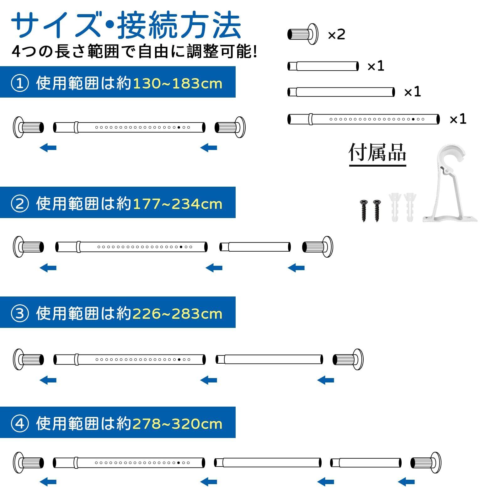 突っ張り棒 強力 取付幅130~320cm 組立簡単 ばね式強力タイプ 穴あけ不要 超強力つっぱり棒 ドリル不要 伸縮棒 耐荷重30~10kg つっぱり棒 炭素鋼製 パイプ直径32mm 省スペース 服掛け 洗濯物干し 室内 浴室 お風呂 窓枠 耐震 転倒防止 日本語説明書付 (ホワイト)