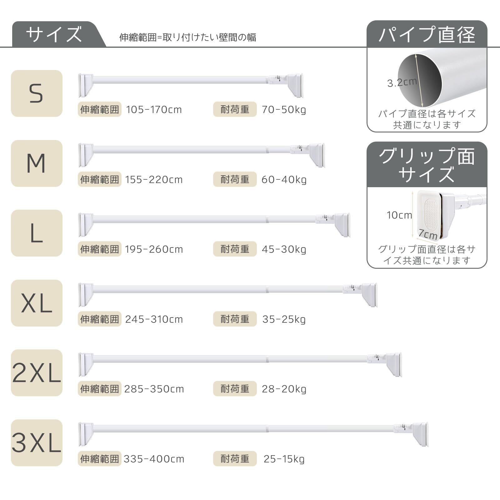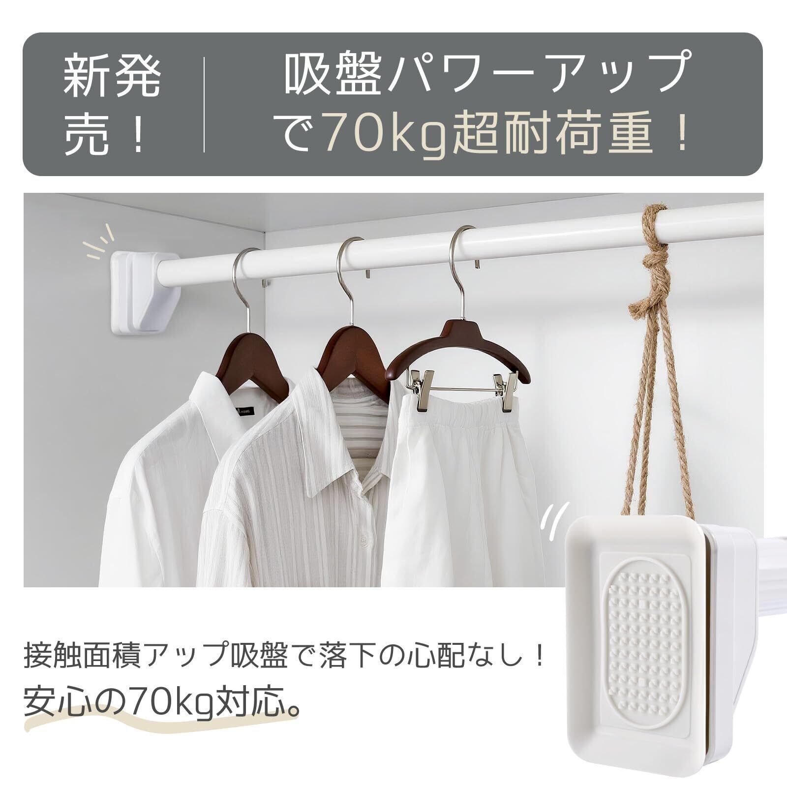 【業界トップ級!最大70kg耐荷重を実現】※最短サイズ(105cm)設置時において最大70kgの驚異的な耐荷重性能を発揮。高強度炭素鋼製の太径32mmパイプと、壁面に「喰いつく」真空吸盤が、重い布団や大量の洗濯物でも「落下の心配」を徹底排除します。