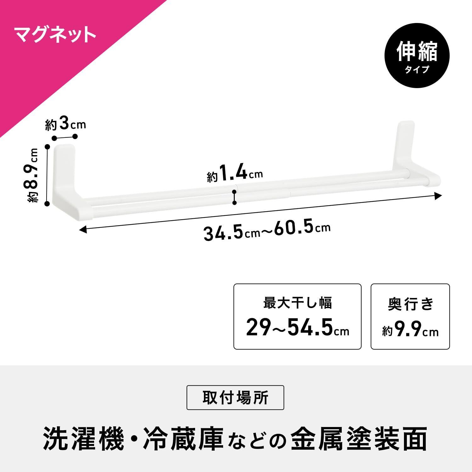 強力 マグネット 伸縮 タオル掛け 伸縮幅 34.5~60.5cm(干幅29~54.5cm) 耐荷重2kg 曲面取付け対応 キズ防止シート付き ホワイト